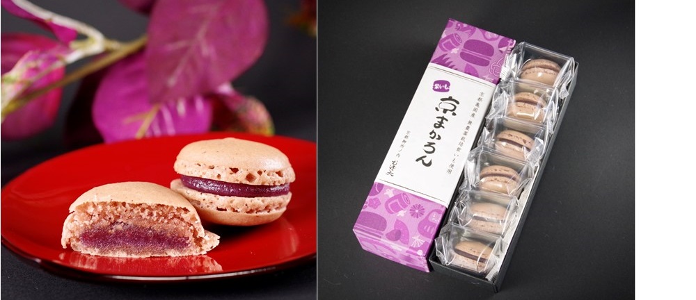 京まかろんならではのしっとりとやわらかな食感をお楽しみください♪亀岡産紫いも「パープルスイートロード」を使用した京まかろん。紫いもを蒸し、皮やクリームに混ぜ込み、職人が丁寧に手作業で仕上げた繊細な風味と食感が特徴です。