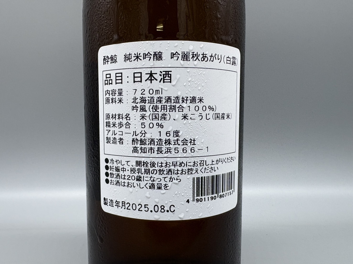 しっかりした旨みとキレの良い後味が特徴です。麹をしっかり造ることにより素材の旨みを引き出し、これに酔鯨特有の酸味を組み合わせ、旨みと後味の良さを両立しました。また低温熟成することにより、味の幅が広がり、旨みをじっくり感じていただけるお酒に仕上げました。