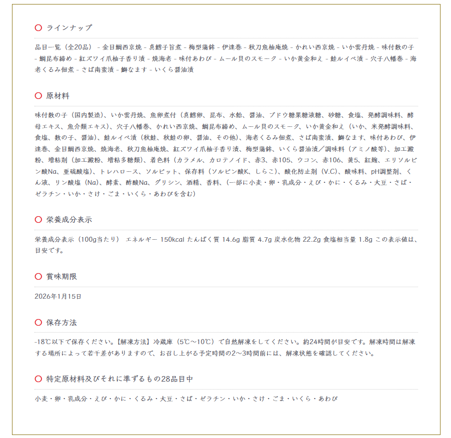 小麦・卵・乳成分・えび・かに・くるみ・大豆・さば・ゼラチン・いか・さけ・ごま・いくら・あわび