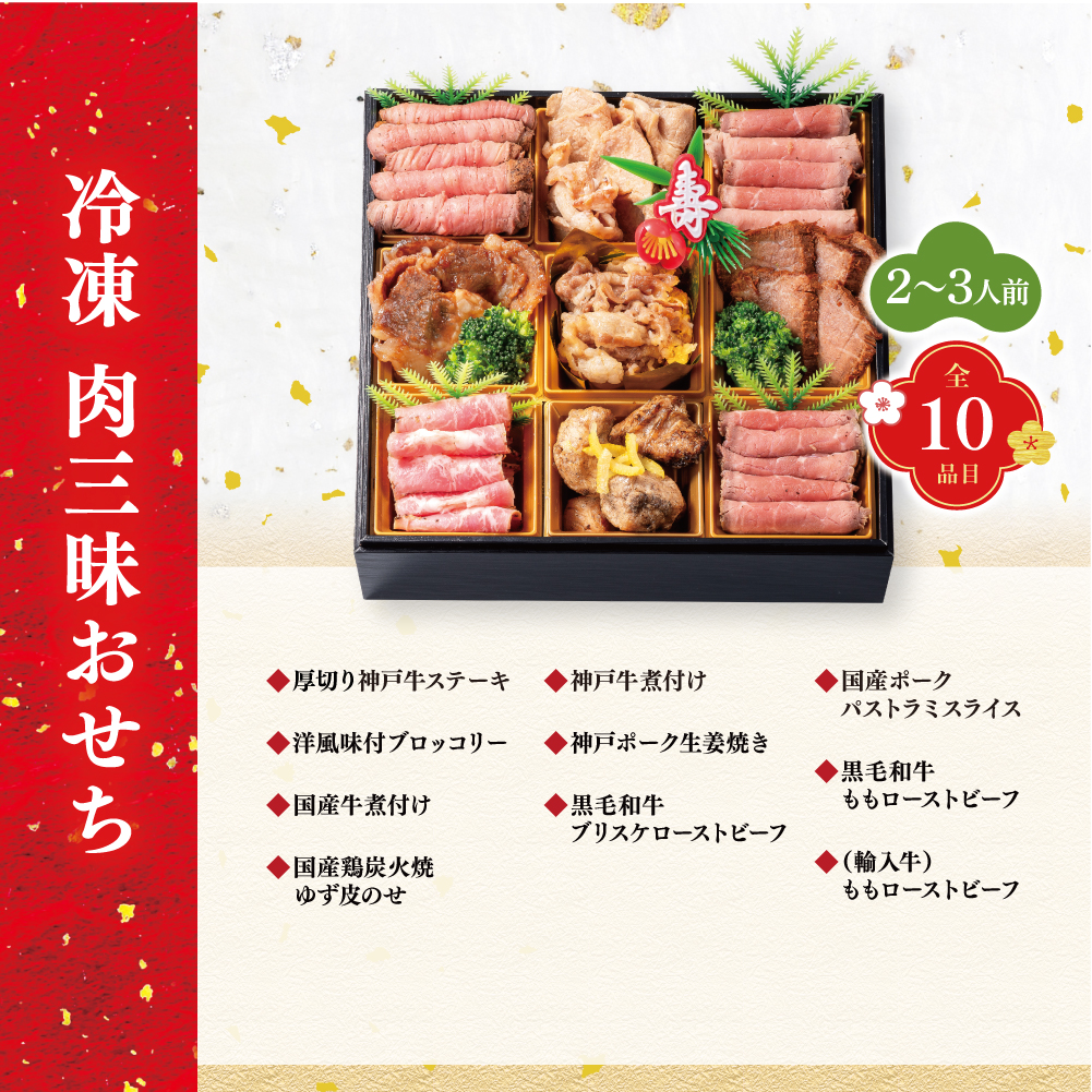 神戸牛ステーキ、黒毛和牛ローストビーフなど選りすぐりの肉料理を贅沢に詰め込んだ、肉好きのためのおせちです。