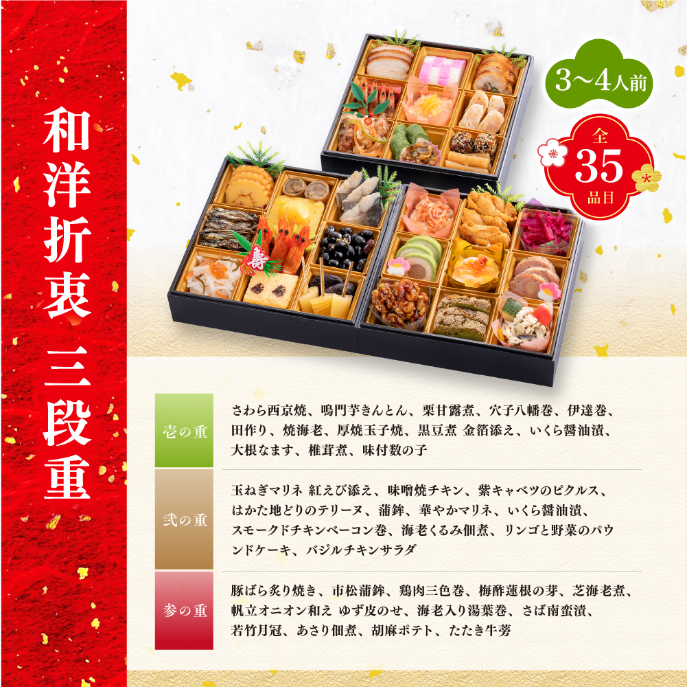 和の伝統料理と洋の創作メニューを絶妙に組み合わせた、全35品目の豪華三段重です。