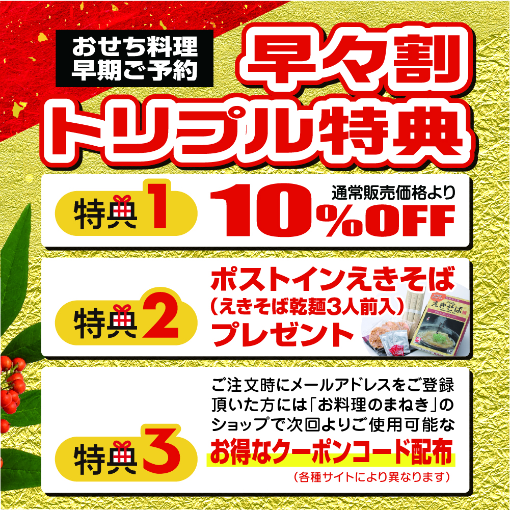 ※ポストインえきそば乾麺につきましては、おせち配達先住所へ別送となります。ポストインタイプのため日時指定は不可。おせち到着日前後に日本郵便(3個以上の場合はヤマト便)にてお届けいたします。