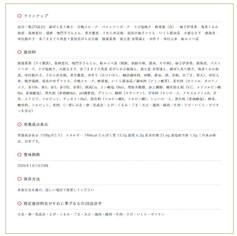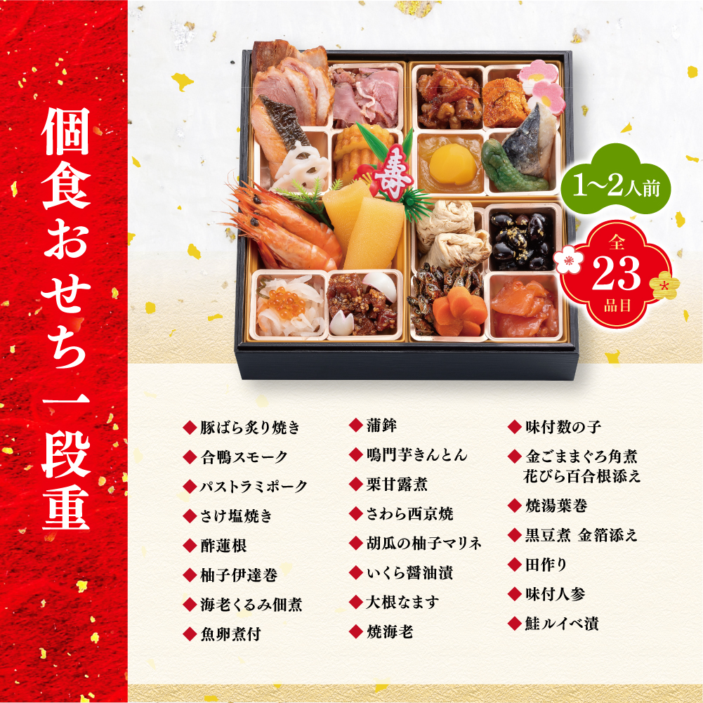 伝統の味わいをぎゅっと詰め込んだ23品目。個食タイプだから、家族それぞれの好みに合わせて選べるのも嬉しいポイントです。