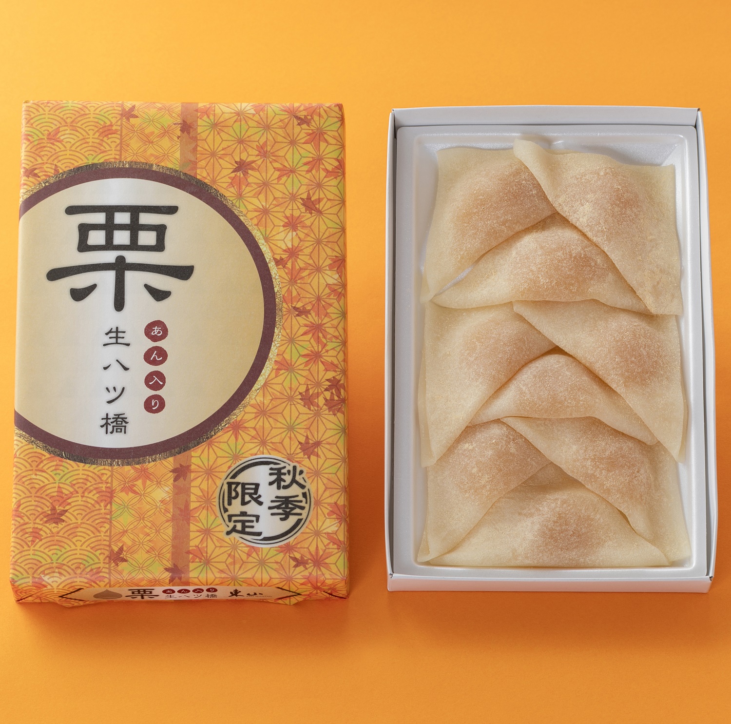 京銘菓である栗餡入り生八ツ橋を秋季限定で製造、販売いたします。包んだ餡は、白餡をベースに仕上げた栗餡には、賽の目に切った栗が入っており、秋の味覚を存分に楽しんでいただける逸品です。販売期間は9月上旬から11月末までの予定となっております。