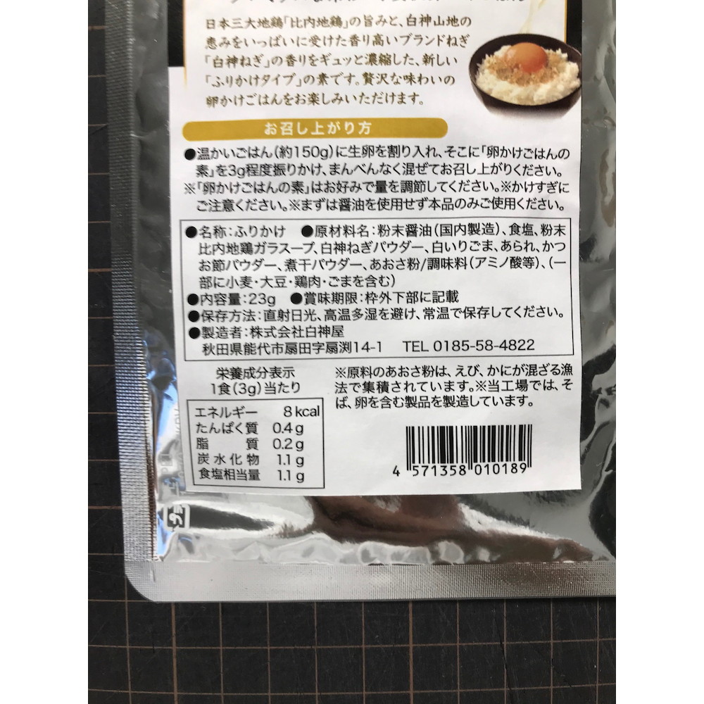 比内地鶏の旨みと、白神山地の恵をいっぱいに受け育てられた白神ねぎの香りをギュッと濃縮した、新しい「ふりかけタイプ」の素です。温かいご飯に生卵を割り入れ、本品をふりかけ味付けしてください。今までにない贅沢な味わいの卵かけごはんが堪能できます。