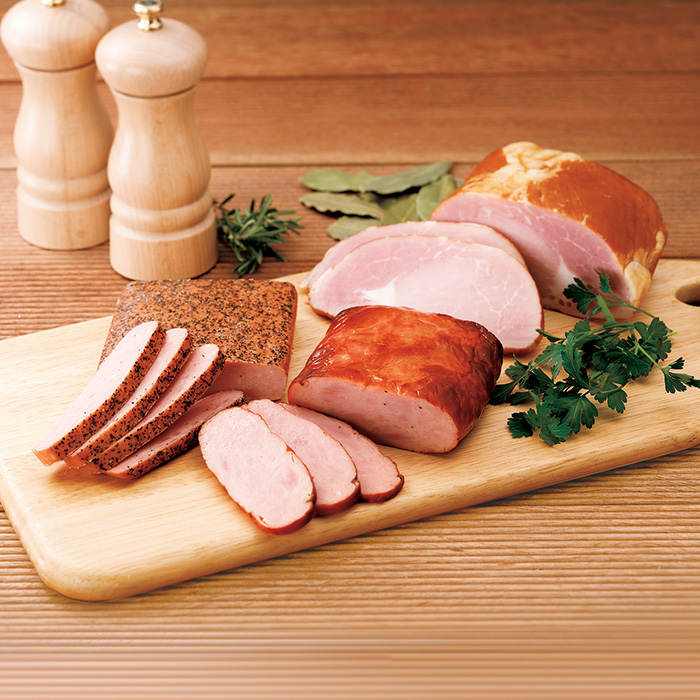 ■規格:特撰ホワイト肩ロース170g、直火焼焼豚170g、あぶり焼ハーブローフ170g、黒胡椒ミートローフ160g、特撰ポークウィンナー(プレーン)80g