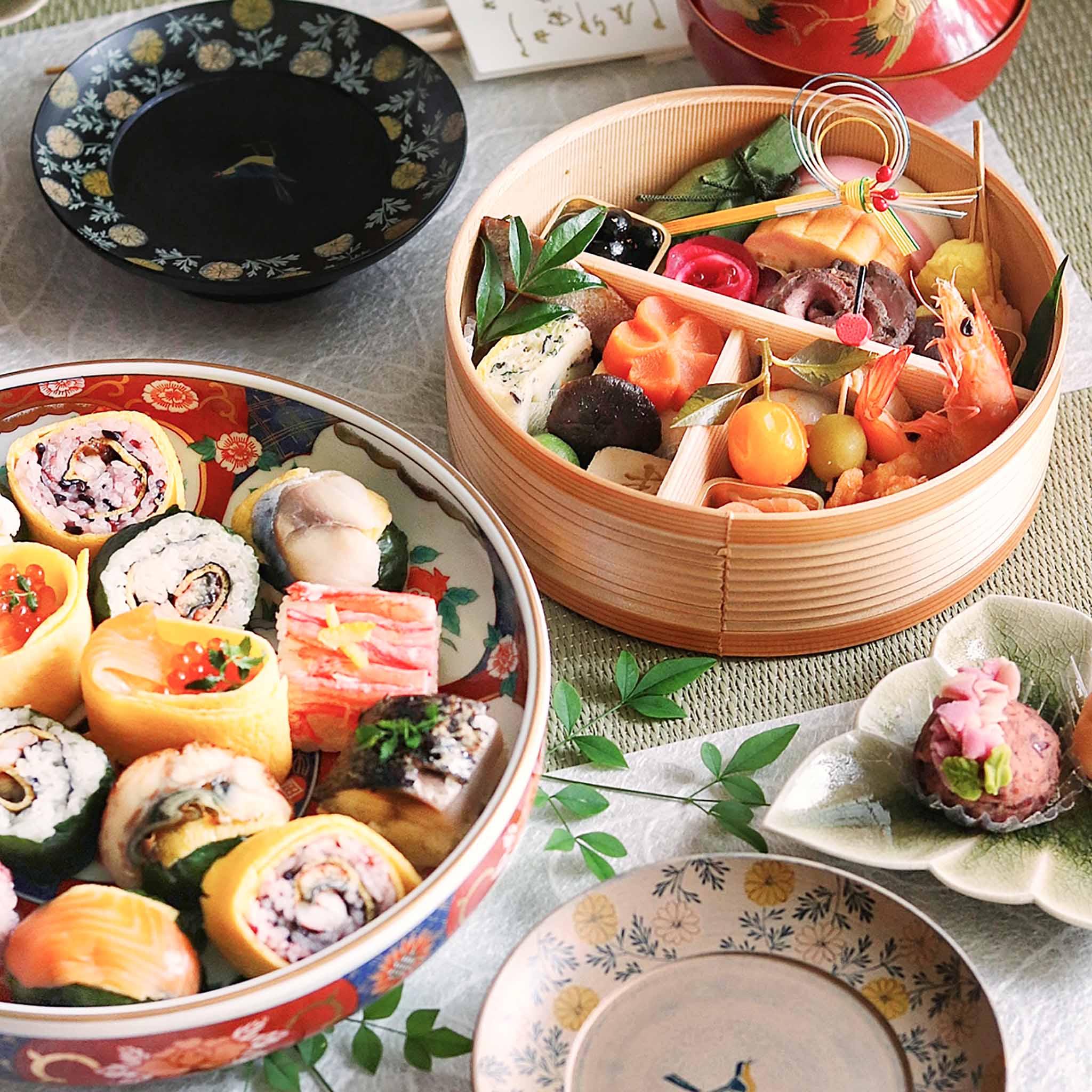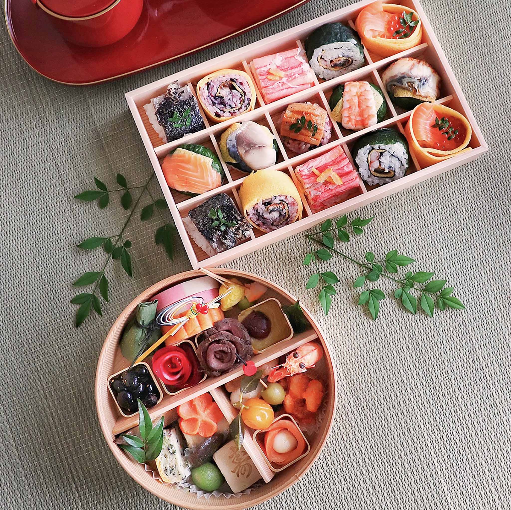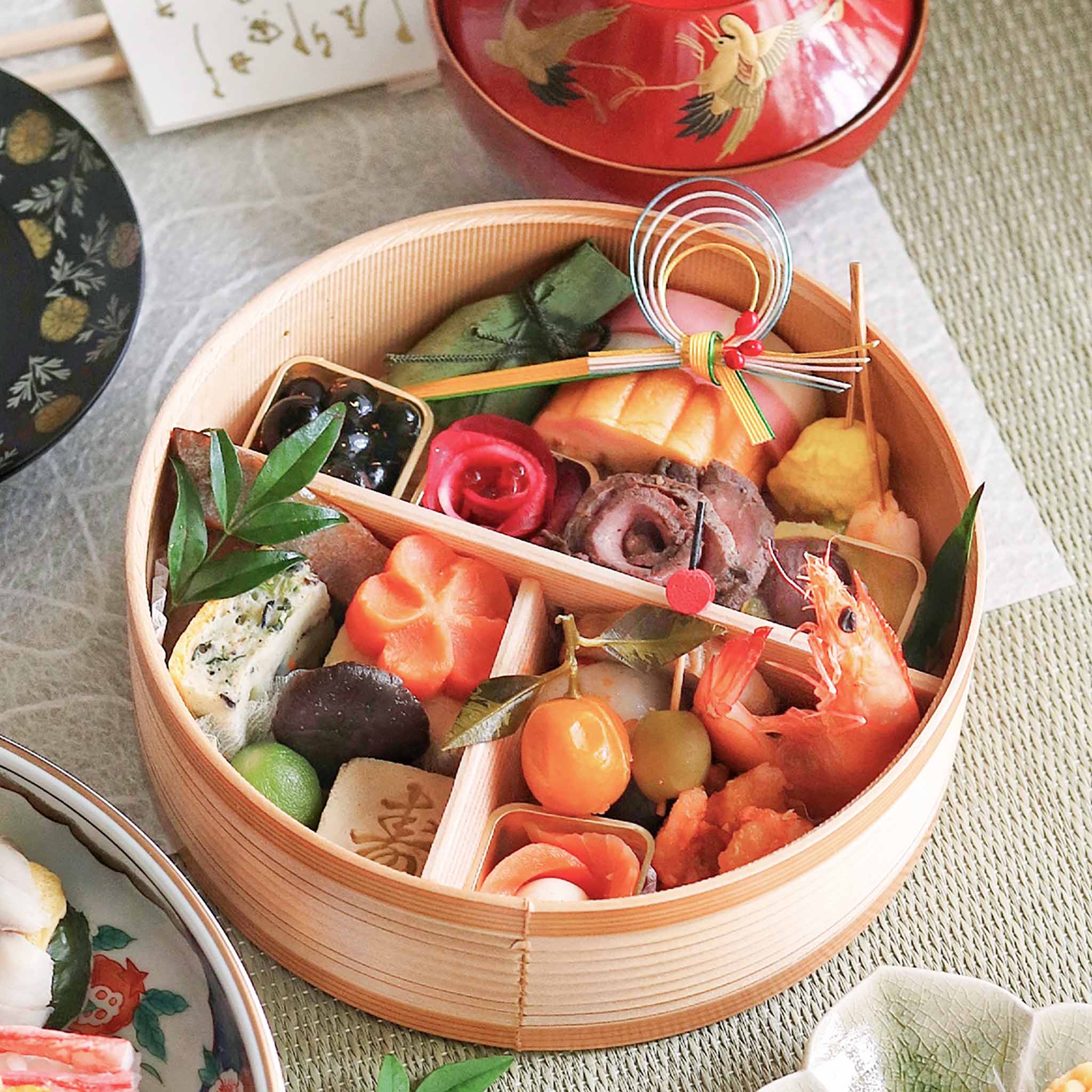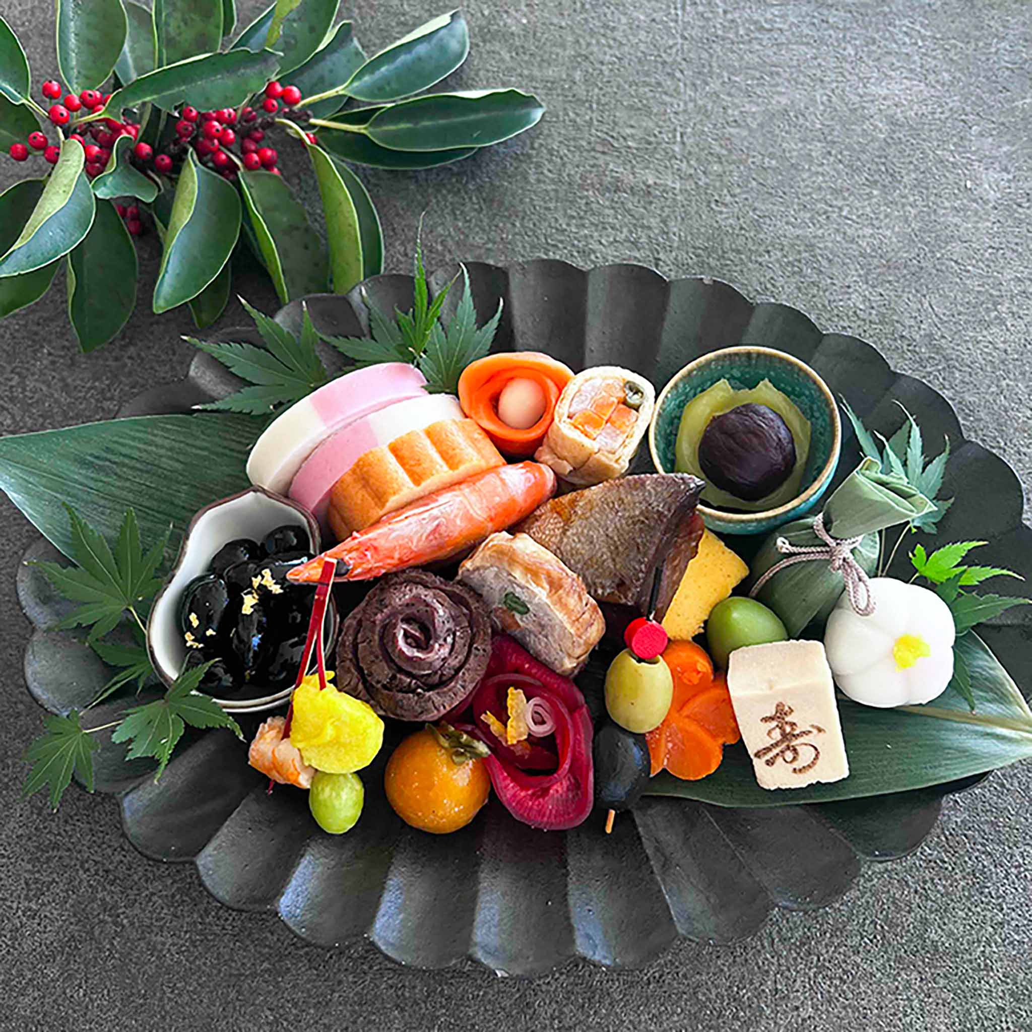 笹巻団子/紅白かまぼこ/伊達巻/イカ海老銀杏串/金粉黒豆/紅白華なます/華ローストビーフ/栗きんとん/有頭海老/三色チキンロール/オリーブのオイル漬け/花もち/金柑のシロップ漬け/エビチリ/モッツァレラチーズの サーモン巻/信田三色巻/ぶり照焼/若桃甘露煮/寿高野豆腐/花形人参/京合わせ/飾り椎茸 計22品目