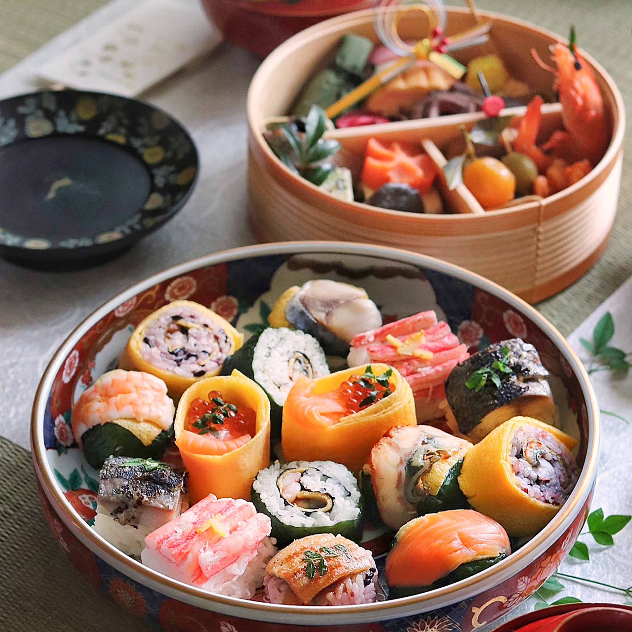 梅酢炙り鯖棒寿司/古代巻/紅ずわいがに棒寿司/わさび巻/鮭いくら錦糸巻(5種類各2個)手鞠わさび葉寿し 鮭/手鞠わさび葉寿し 鯖/手鞠わさび葉寿し 海老/手鞠わさび葉寿し 鰻/古代あなら寿し(5種類各1個)