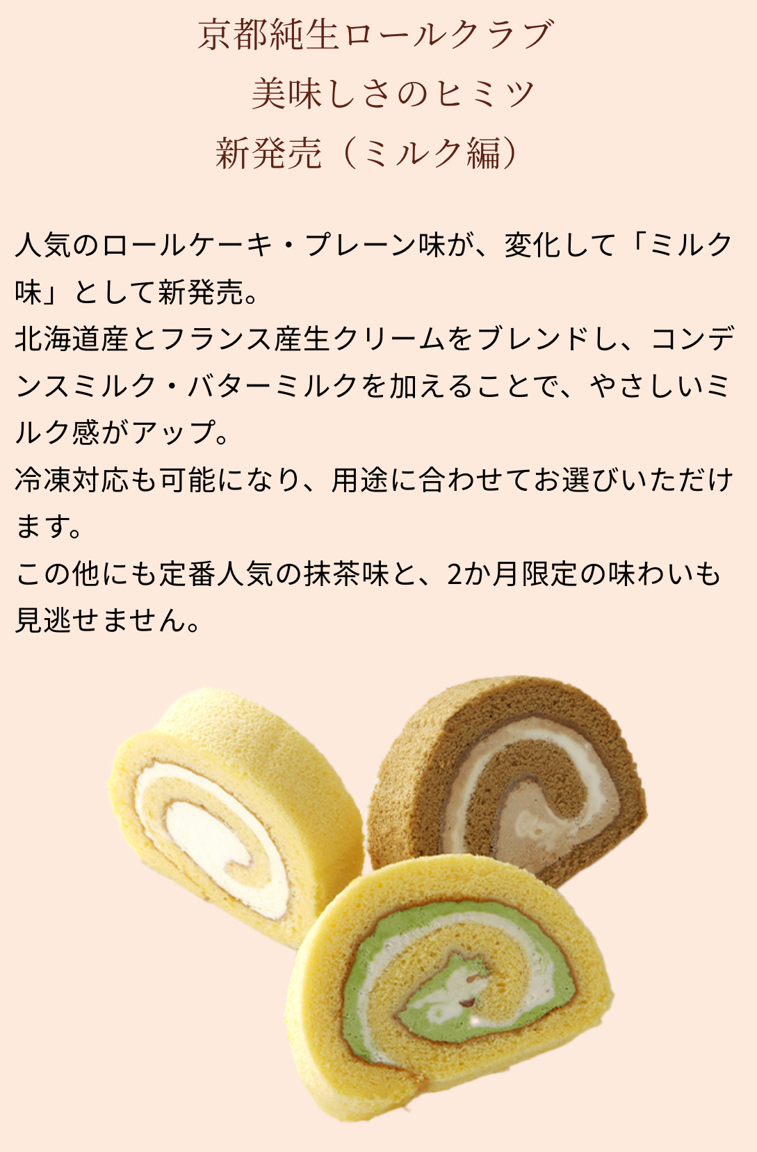 抹茶味:しっとりスポンジに風味高い抹茶と小豆をアクセントにした生クリームの2層仕立てです。