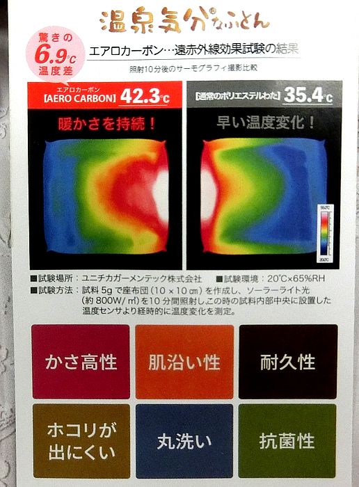 *ユニチカのエアロカーボン綿を使用。遠赤外線効果と断熱効果でさらに温かくなりました。