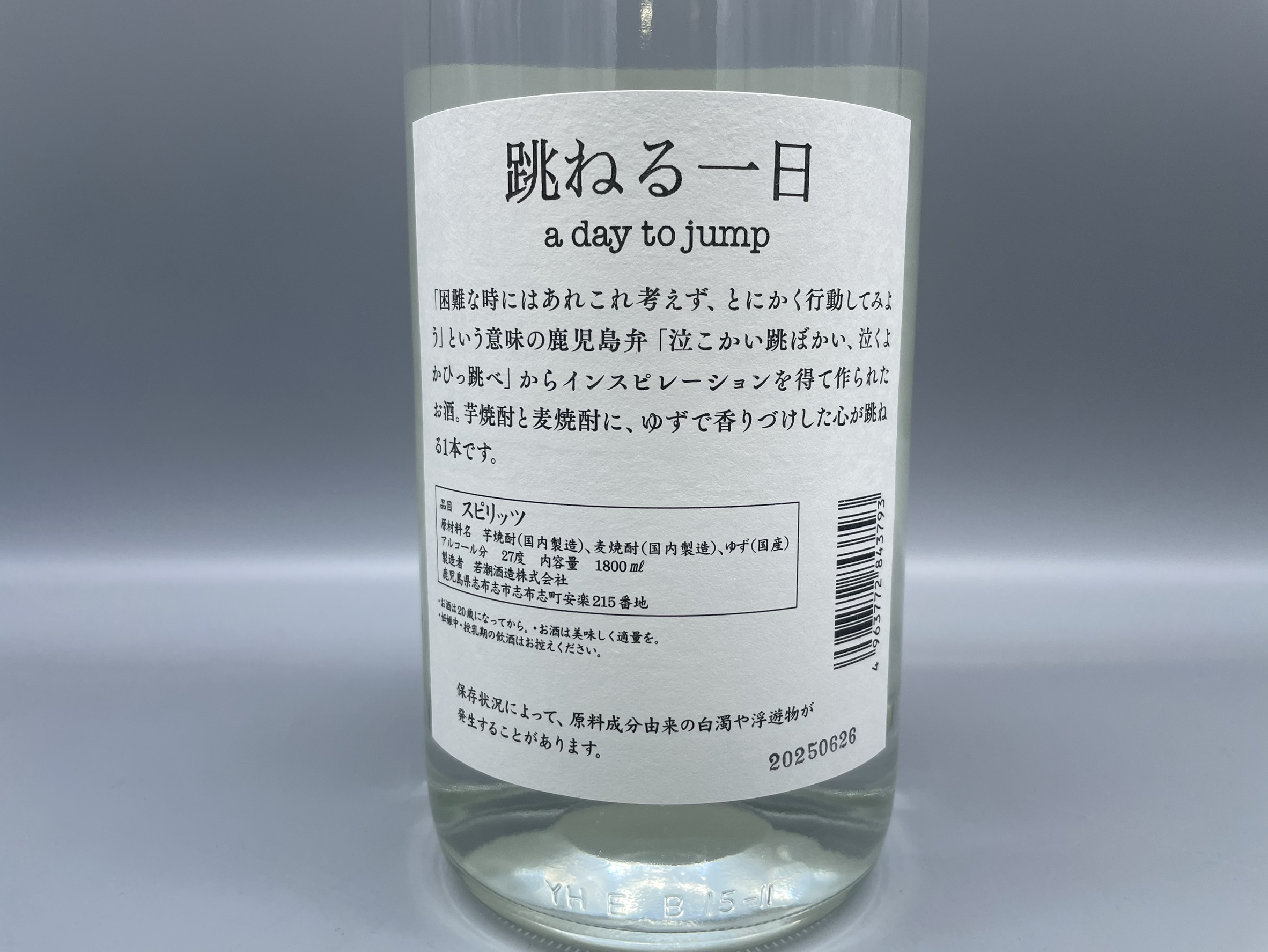 「困難な時にはあれこれ考えず、とにかく行動してみよう」という意味の鹿児島弁「泣こかい跳ぼかい、泣くよかひっ跳べ」からインスピレーションを得て作られたお酒。芋焼酎と麦焼酎に、ゆずの皮と果汁で香りづけした心が跳ねる1本です。