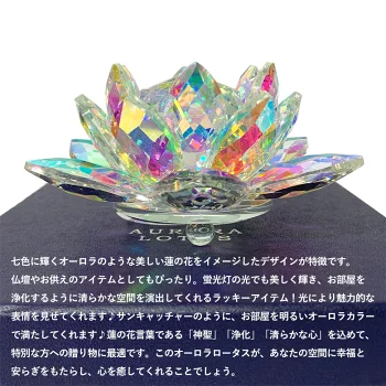 七色に輝くオーロラのような美しい蓮の花をイメージしたデザインが特徴です。 仏壇やお供えのアイテムとしてもぴったり。蛍光灯の光でも美しく輝き、 お部屋を浄化するように清らかな空間を演出してくれるラッキーアイテム! 光により魅力的な表情を見せてくれます♪ サンキャッチャーのように、お部屋を明るいオーロラカラーで満たしてくれます♪ 蓮の花言葉である「神聖」「浄化」「清らかな心」を込めて、 特別な方への贈り物に最適です。 このオーロラロータスが、あなたの空間に幸福と安らぎをもたらし、心を癒してくれることでしょう。
