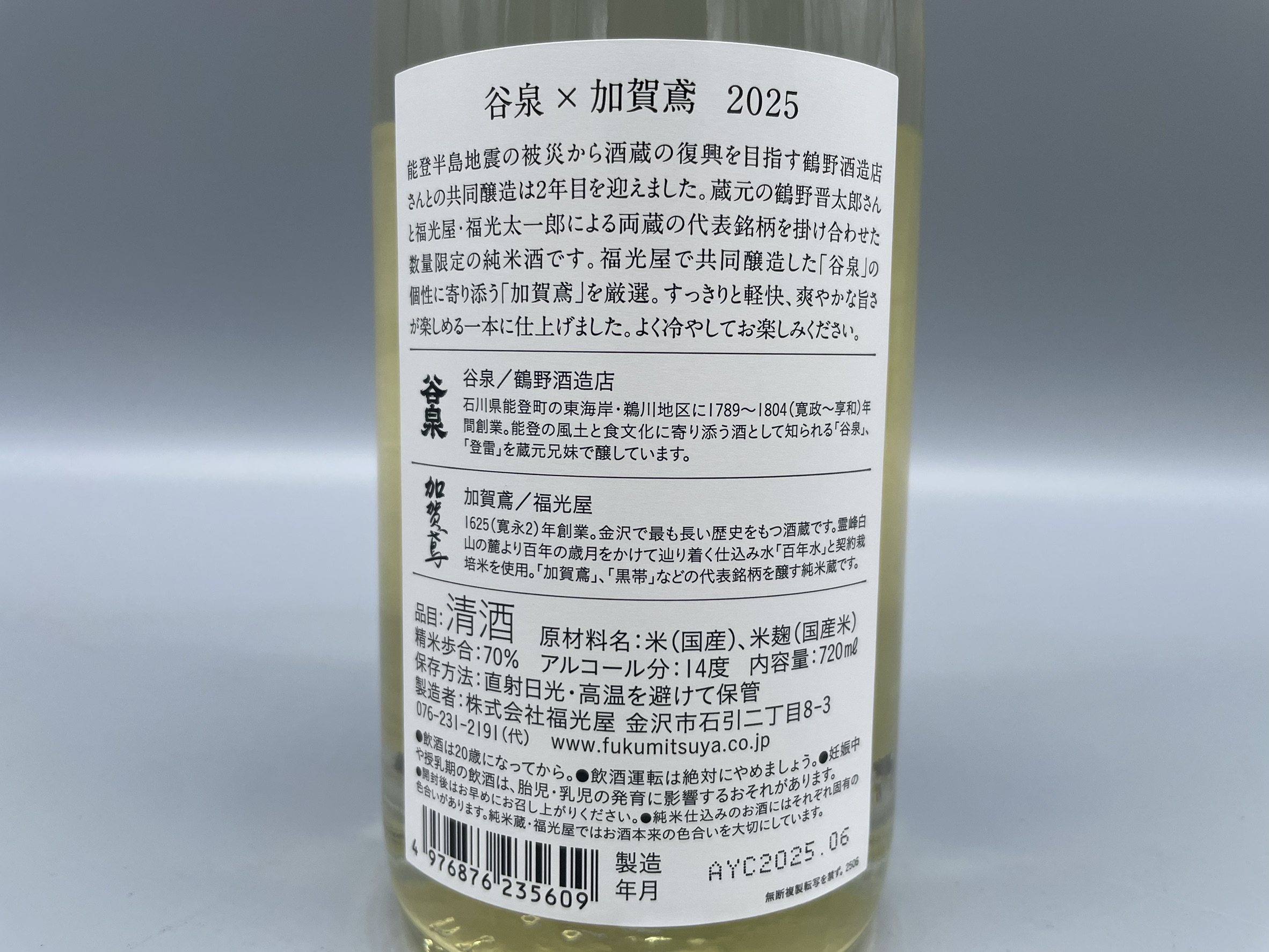 奥能登・鶴野酒造店と金沢・福光屋の代表銘柄を1対1でブレンドする2年目の共同開発「谷泉×加賀鳶 2025 純米」