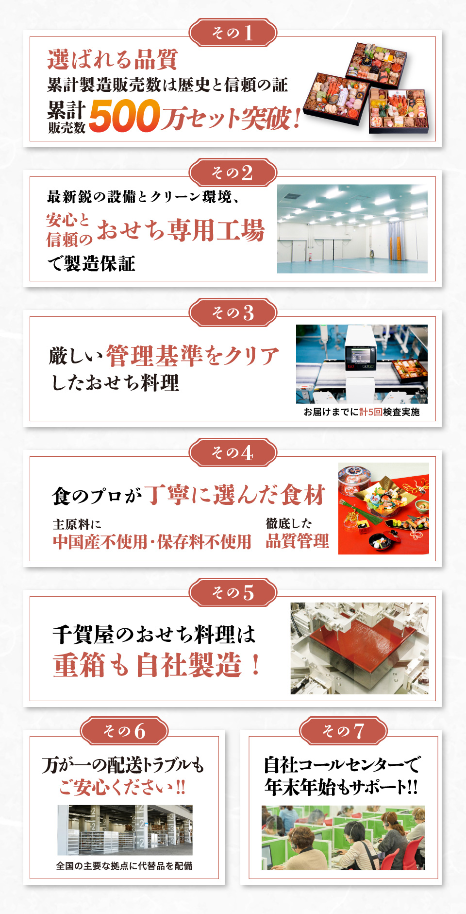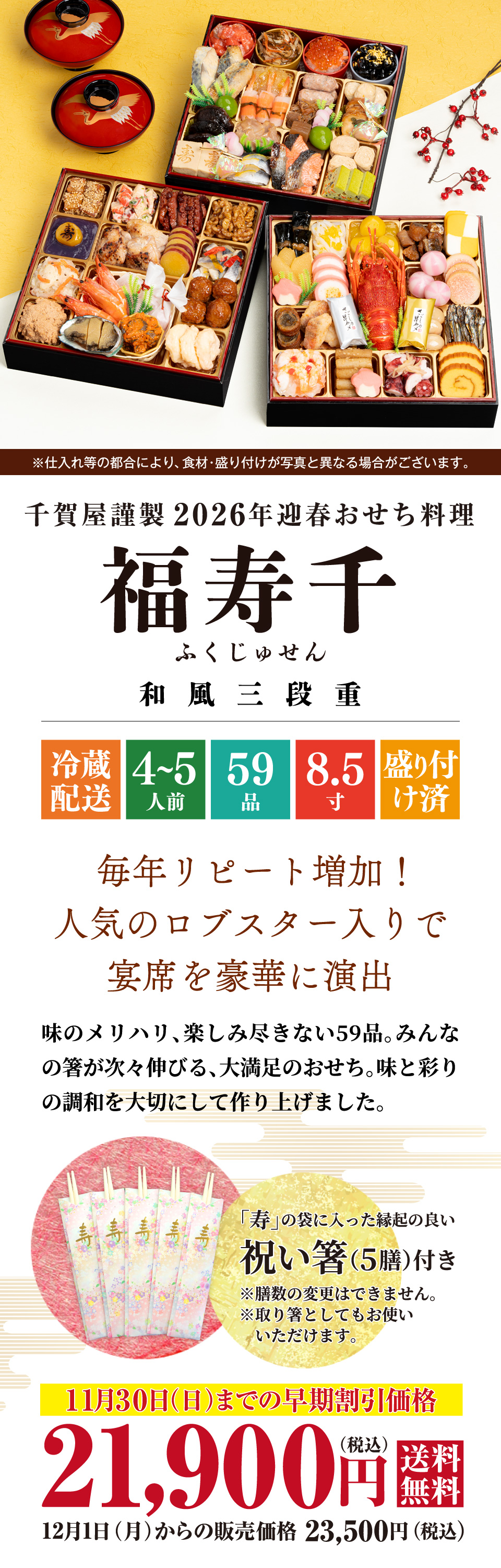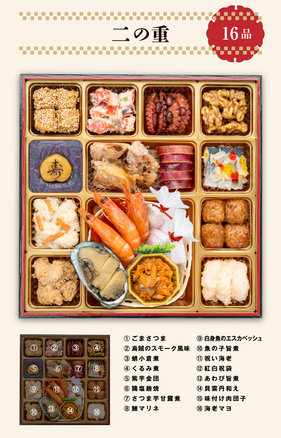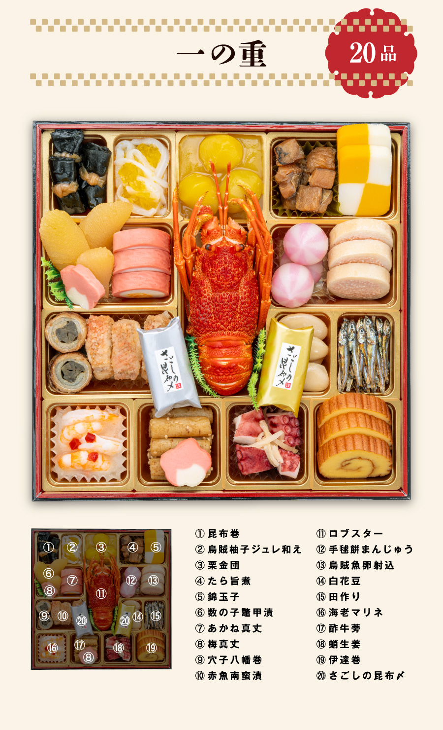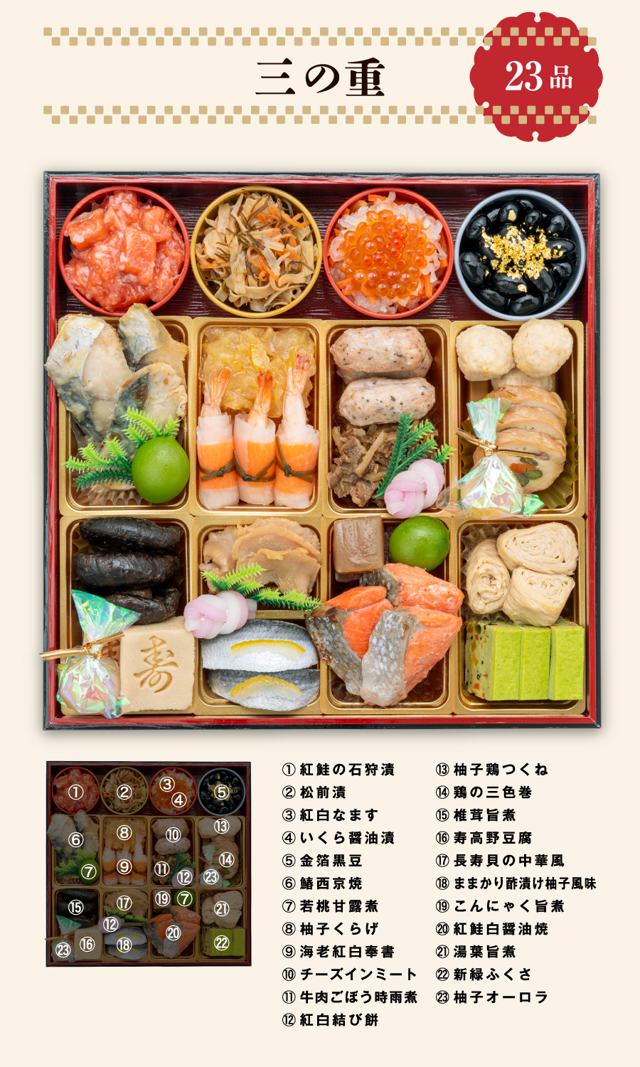 味のメリハリ、楽しみ尽きない59品。みんなの箸が次々伸びる、大満足のおせち。味と彩りの調和を大切にして作り上げました。