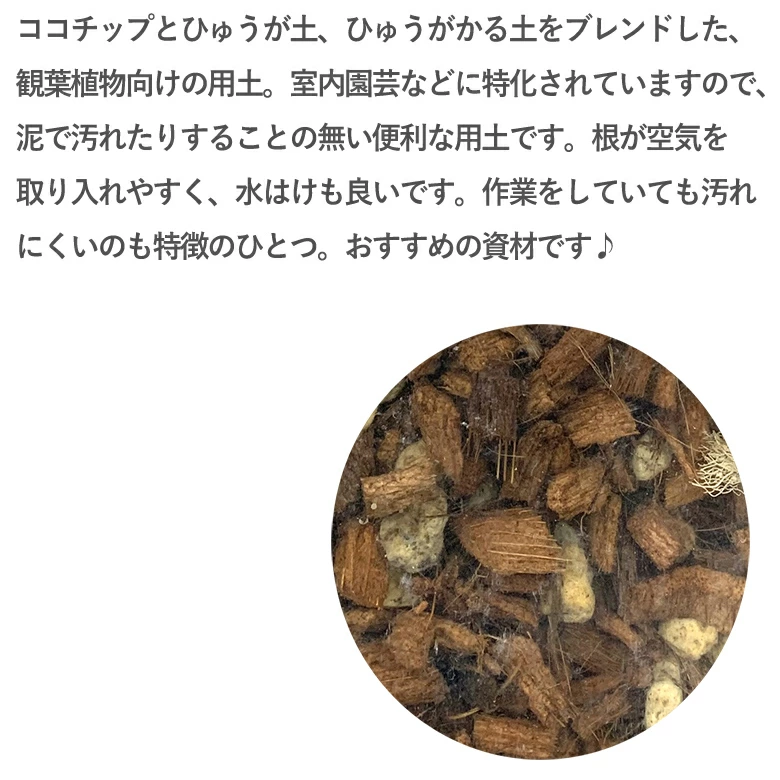 ココチップとひゅうが土、ひゅうがかる土をブレンドした、観葉植物向けの用土。室内園芸などに特化されていますので、泥で汚れたりすることの無い便利な用土です。根が空気を取り入れやすく、水はけも良いです。作業をしていても汚れにくいのも特徴のひとつ。おすすめの資材です♪