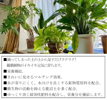減ってしまった土の上から足すだけラクラク!観葉植物がイキイキ元気に育ちます ・栄養補給 ・きれいに見せるマルチング効果 ・虫が寄りにくく、水はけを良くする鉱物質原料を配合 ・微生物の活動を抑える鹿沼土を多く配合 ・ゆっくり効く緩効性肥料を配合し、栄養分を補給します 【主原料】鹿沼土・ココナッツファイバー・赤玉土・パーライト