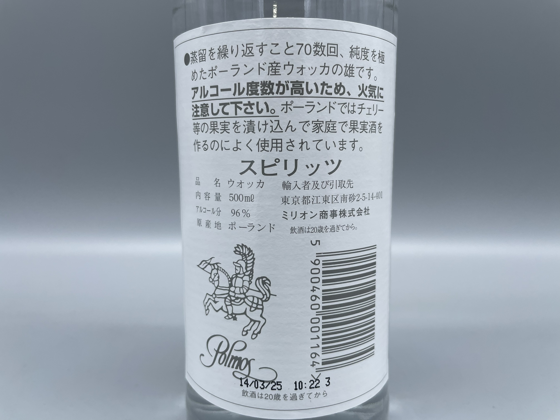ウォッカは、原酒を活性炭ろ過や加水をしてアルコール度数を調整したのもが大半ですが、スピリタスは厳選されたライ麦を主体とした穀類を原料とし、70数回の蒸留を繰り返すことで96度の高アルコール濃度に仕上がります。