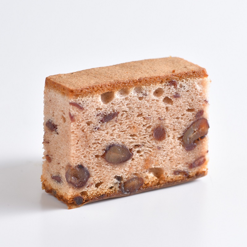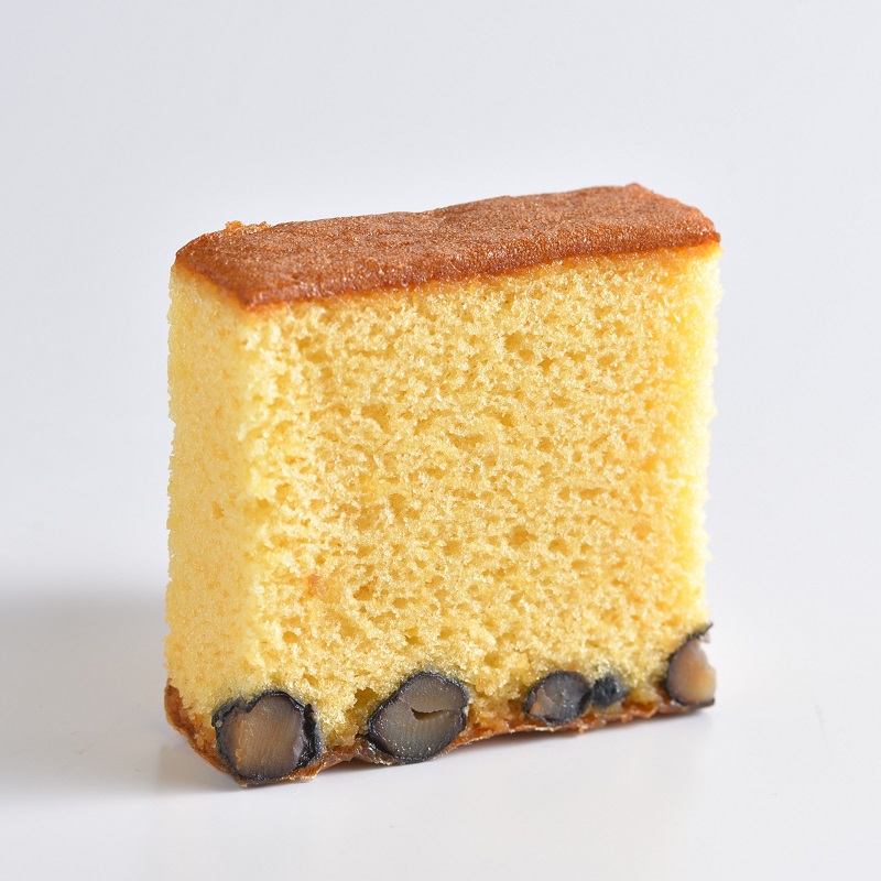 【大納言小豆】 北海道産の粒餡を練り込んだもっちりとした食感の生地に、大納言小豆の優しい甘みが広がる、まるであんこを食べているかのようなカステラです。