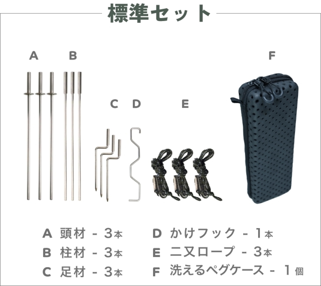 (頭材 3本・柱材 3本・足材 3本・かけフック 1本・二又ロープ 3本)