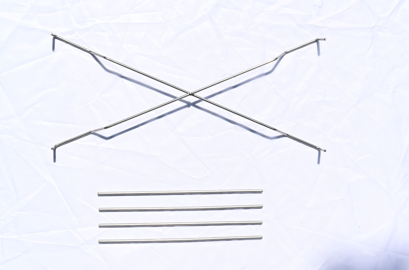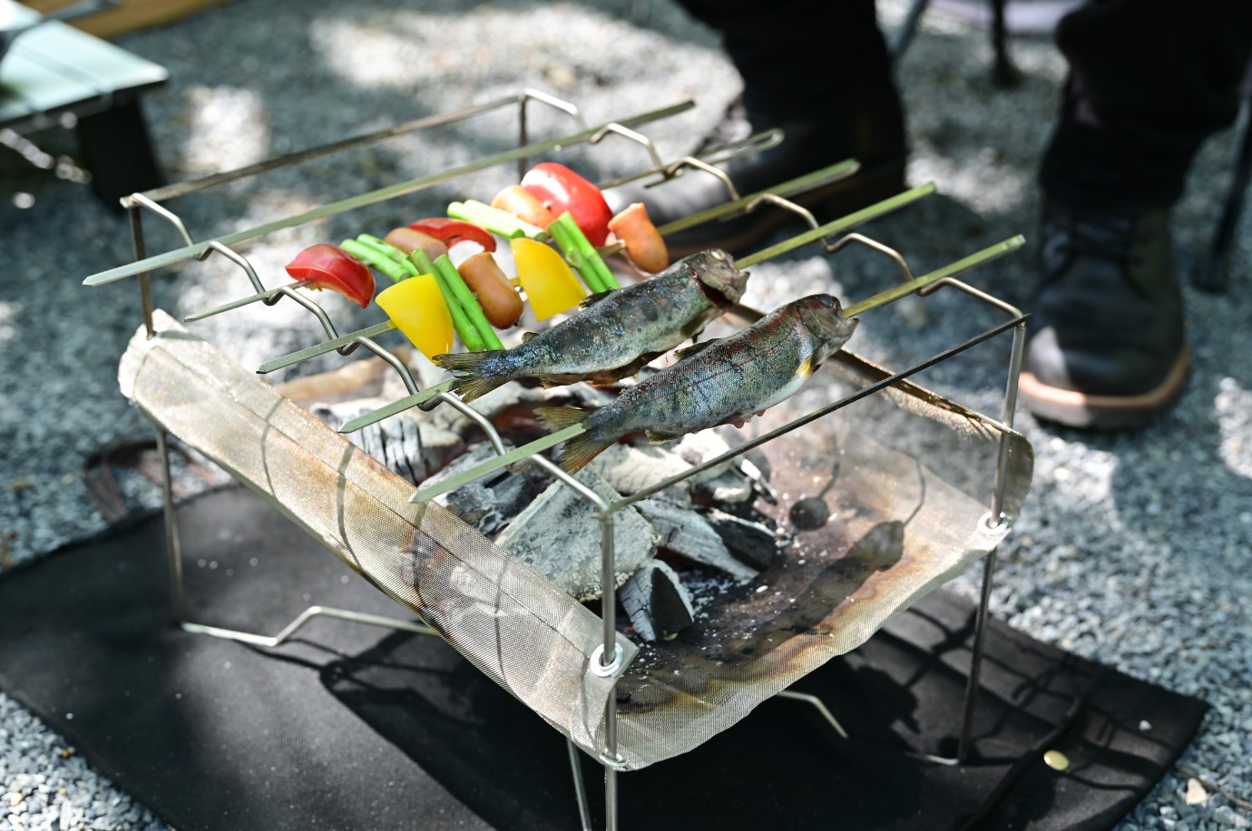 串に魚や肉、マシュマロなどの食材を刺し、直火調理が可能、かつ、串が五徳にも変化し、調理器具を使用した本格的な料理を楽しむことができます。