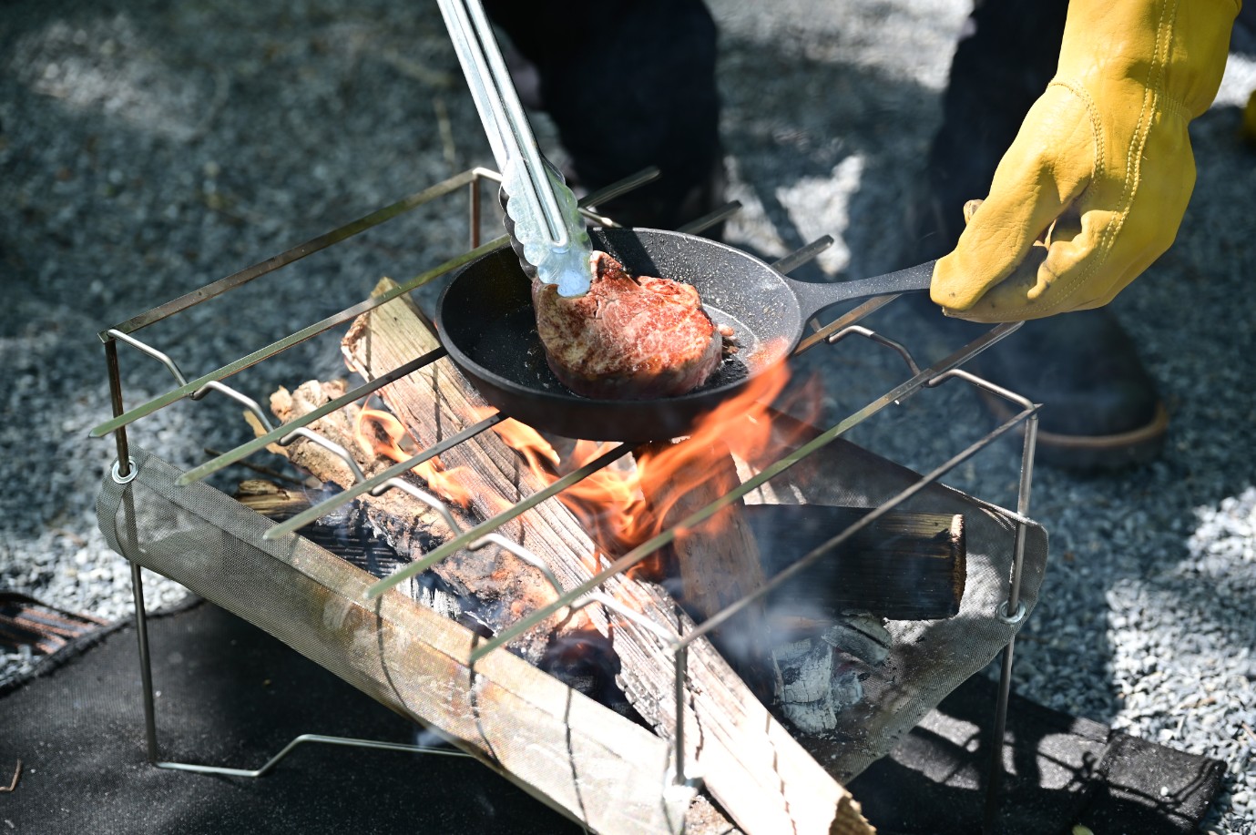 「MULTI SOLO Bonfire Stand」は、焚き火はもちろんのこと本格グリル料理もこれ1台で楽しめます。