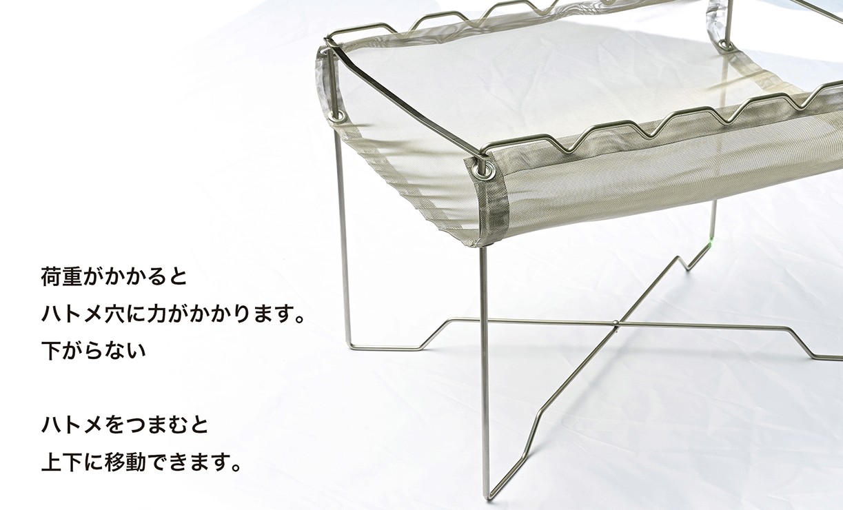 ドライバーや工具が不要で、網のハトメ穴だけで高さ調節が可能、お好みに合わせて火加減が簡単に調節できます。シンプルな構造ながら幅広い調理が可能です。
