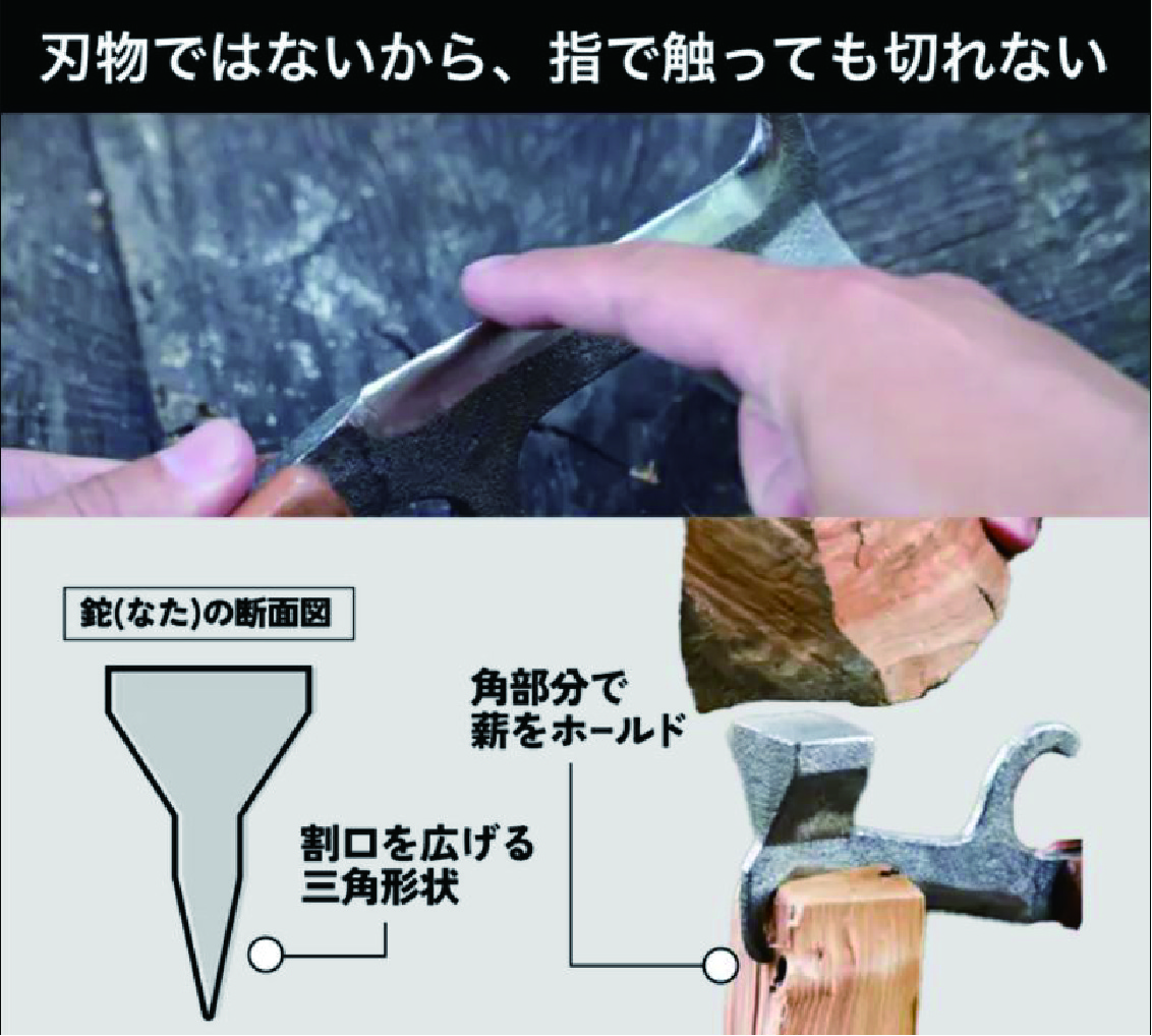 鉈の部分は、刃物ほど鋭利ではないので、鉈部分に触れたり、子供が持っても大丈夫な設計になっています。別の薪など重たいもので上から叩いてご使用ください。お子様と一緒に薪割りをするのにも最適です。