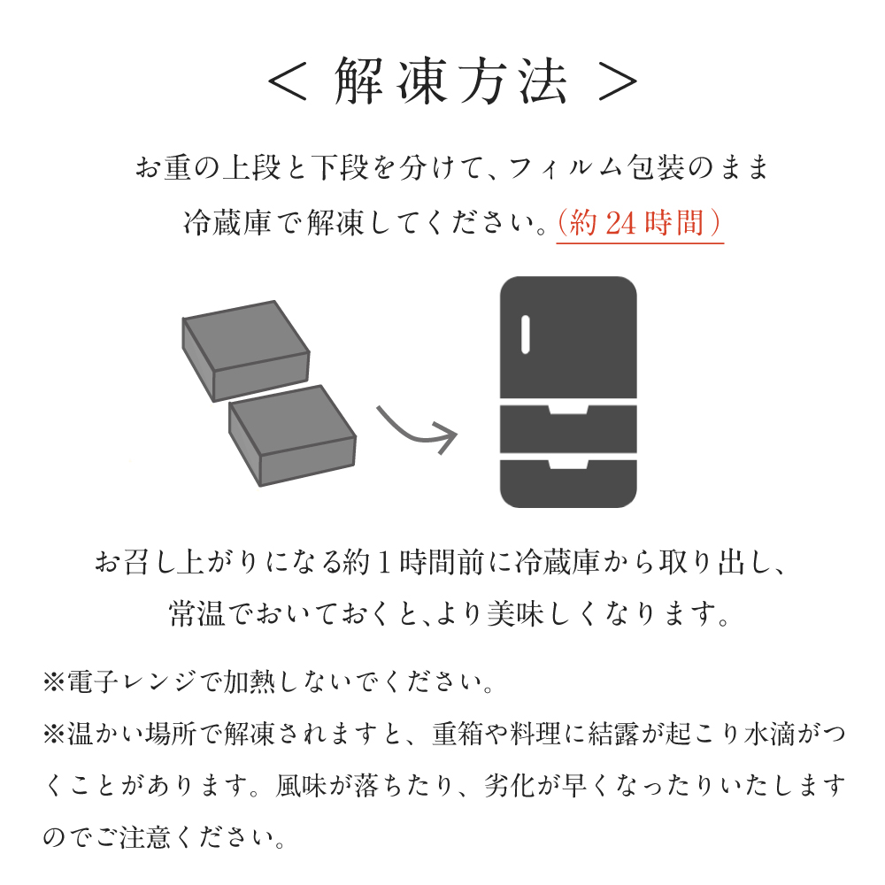 ※温かい場所で解凍されますと、重箱や料理に結露が起こり水滴がつくことがあります。風味が落ちたり、劣化が早くなったりいたしますのでご注意ください。