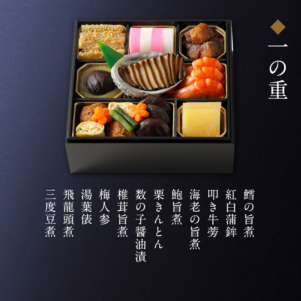 「海老の旨煮」、「鮑旨煮」など当茶寮自慢の逸品や縁起の良い食材を2、3人でお愉しみいただけます。