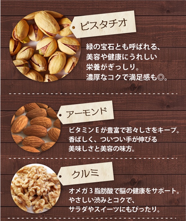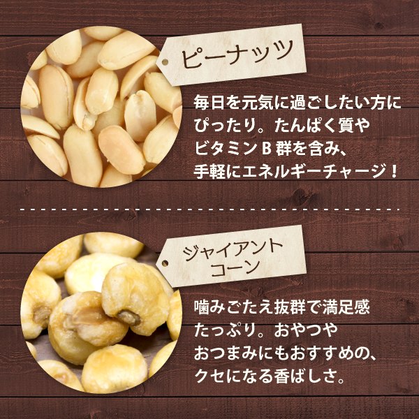 原材料 ピーナッツ(中国)、アーモンド、ジャイアントコーン、カシューナッツ、ヘーゼルナッツ、植物油脂、クルミ、ピスタチオ、食塩/調味料(アミノ酸等)