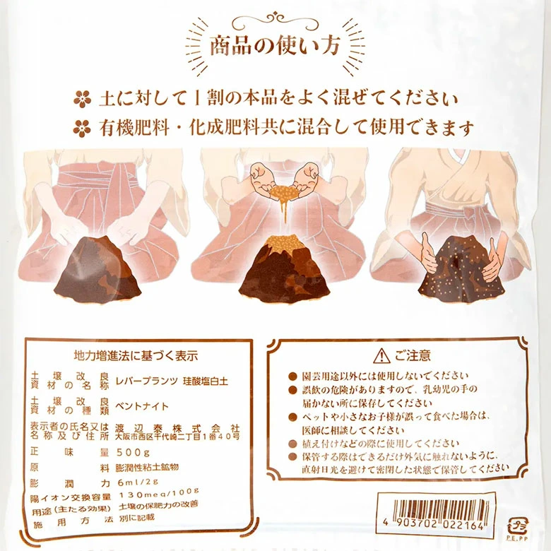 天然鉱物の「ケイ酸塩白土」です。 土に加えることで、肥料成分やミネラルを長い期間保ちます。 また、土の団粒化を促進し、透水性・通気性を改善します。 保水効果も高く、根腐れ防止につながるのも特長です。