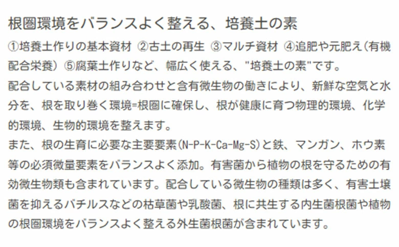 根圏環境をバランスよく整える、培養土の素 1.培養土作りの基本資材 2.古土の再生 3.マルチ資材 4.追肥や元肥え(有機配合栄養) 5.腐葉土作りなど、幅広く使える、"培養土の素"です。 配合している素材の組み合わせと含有微生物の働きにより、新鮮な空気と水分を、根を取り巻く環境=根圏に確保し、根が健康に育つ物理的環境、化学的環境、生物的環境を整えます。 また、根の生育に必要な主要要素(N-P-K-Ca-Mg-S)と鉄、マンガン、ホウ素等の必須微量要素をバランスよく添加。 有害菌から植物の根を守るための有効微生物類も含まれています。 配合している微生物の種類は多く、有害土壌菌を抑えるバチルスなどの枯草菌や乳酸菌、根に共生する内生菌根菌や植物の根圏環境をバランスよく整える外生菌根菌が含まれています。