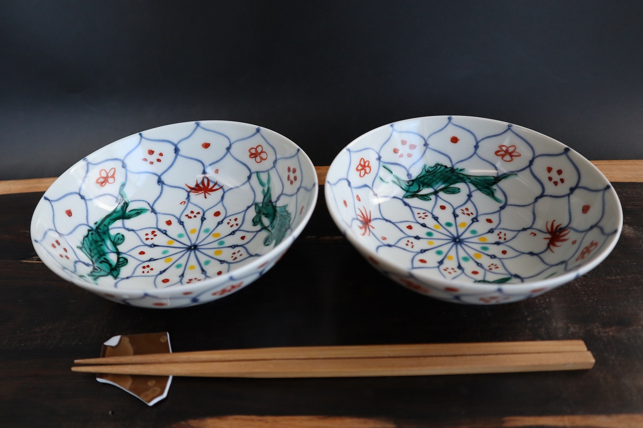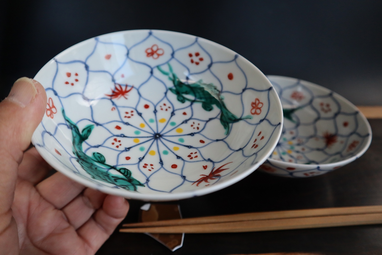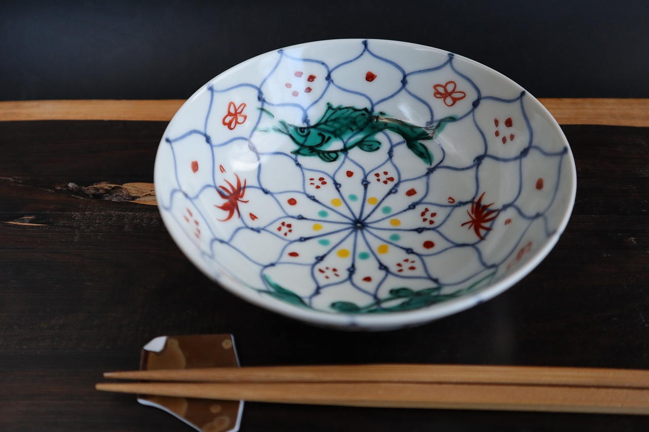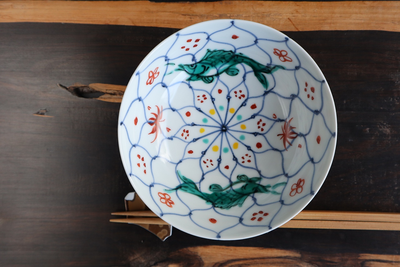 魚を上絵和青にて手描きしています。