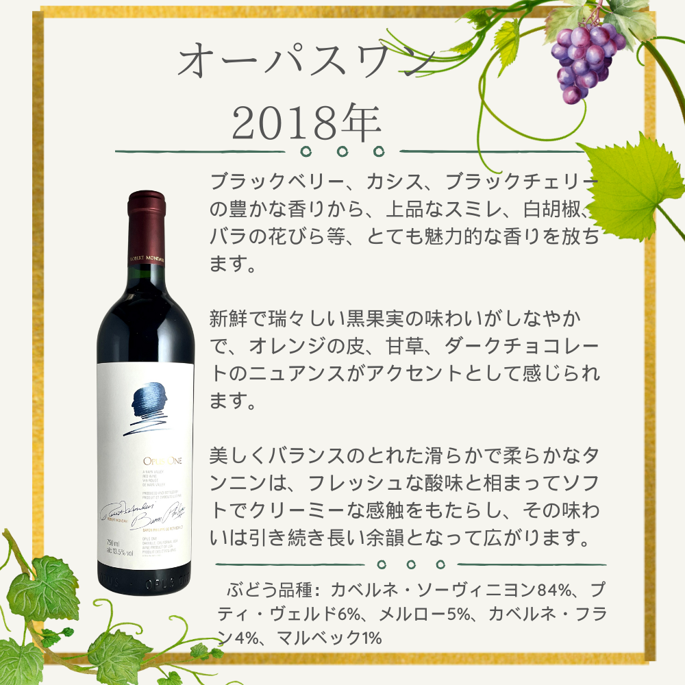 オーパス・ワン 2018年――伝説を紡ぐ極上の一杯。果実の豊潤さと完璧なバランスが織り成す、その壮麗な余韻をグラスの中でご堪能ください。