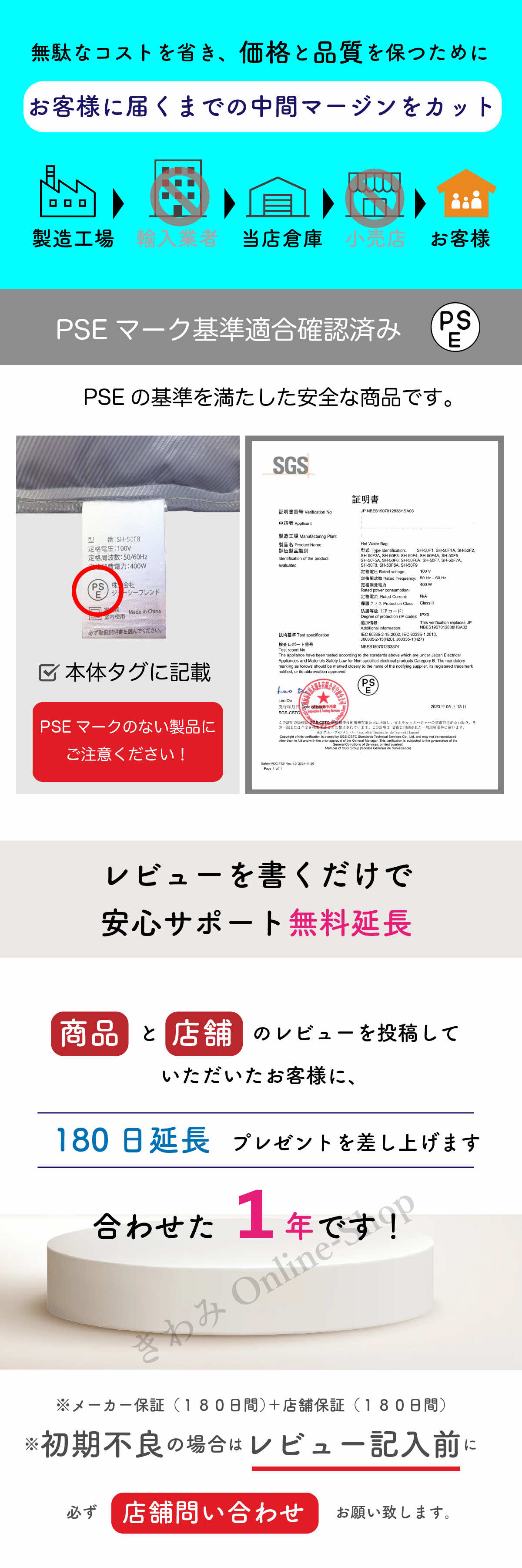 安全装置:温度ヒューズ(86℃・145℃)、サーモスタット