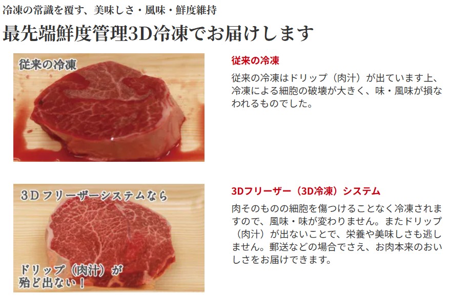 サシの入り具合で適度な歯ごたえがあり、噛むと肉の脂がじんわりとにじみ出て口いっぱいに脂の甘味が広がります。肉の色、ツヤ、脂肪の質、香り、そして内部の状態など、総合的に判断して品質の良いお肉を厳選します。美味しさそのまま(肉汁出ない)最新型急速冷凍3Dフリーザを使用して、新鮮なお肉をお届けします。