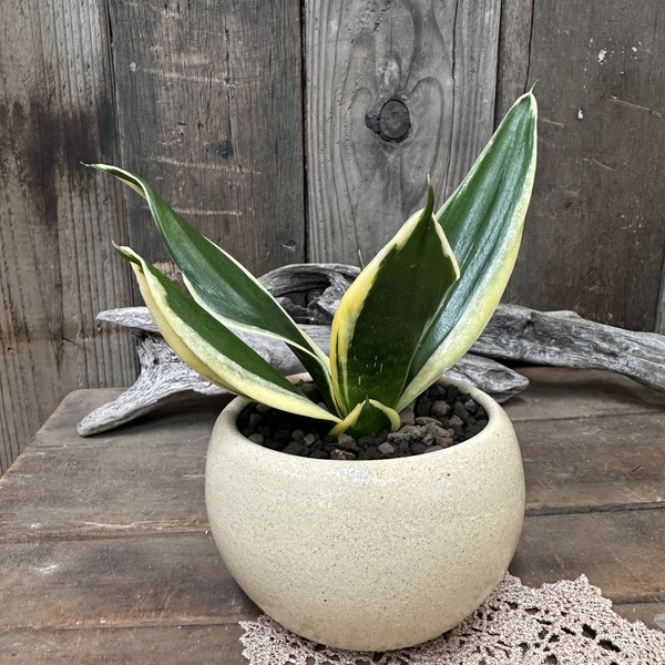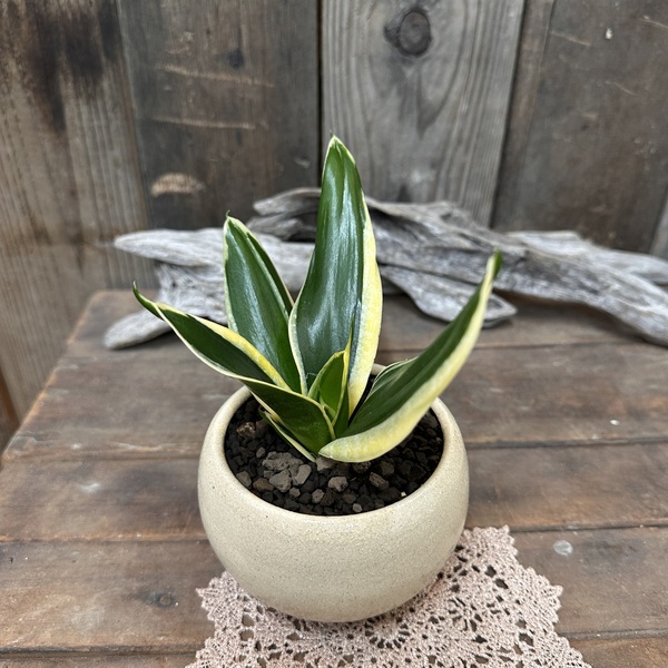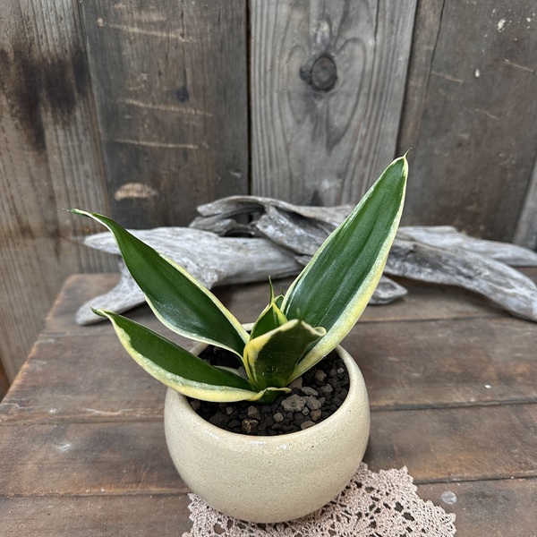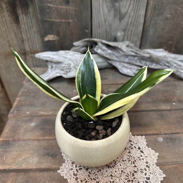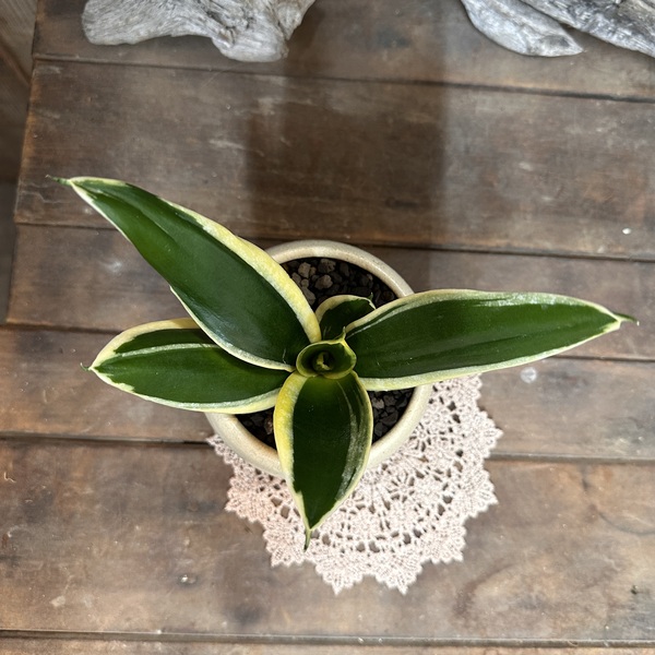 サンスベリア「ハニーバニー」は、ロゼット状に広がる小型でコンパクトな草姿と、明るい黄緑色の葉縁に黄金色の斑(ふ)が入る可愛らしい見た目が最大の特徴で、手のひらサイズで飾りやすく、空気清浄効果も期待できる丈夫な品種です。乾燥に強く育てやすいので初心者にもおすすめですが、風通しの良い明るい場所を好み、蒸れと寒さには注意が必要です。