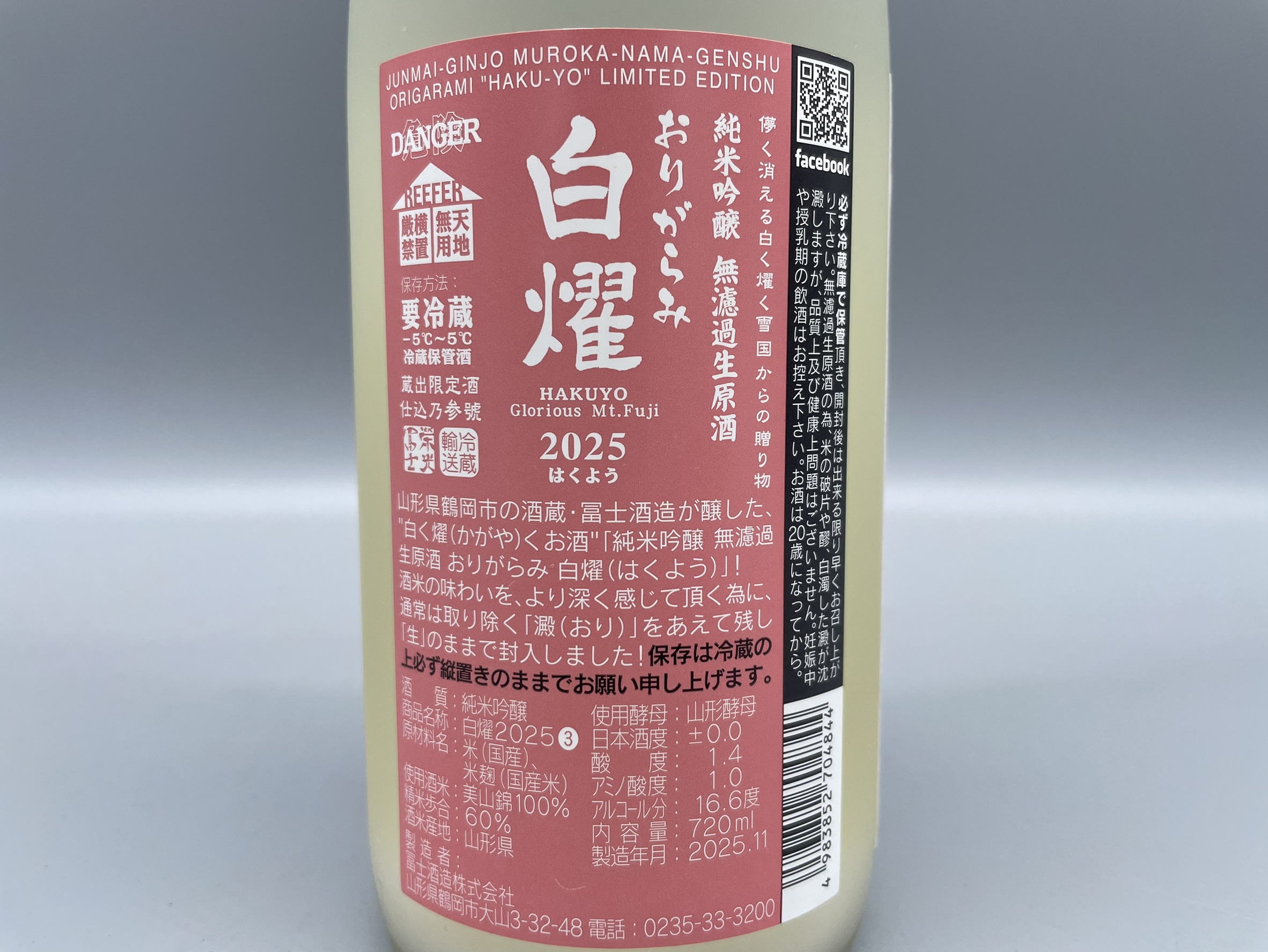 “白く燿(かがや)くお酒”「純米吟醸 無濾過生原酒 おりがらみ 白燿(はくよう)」!