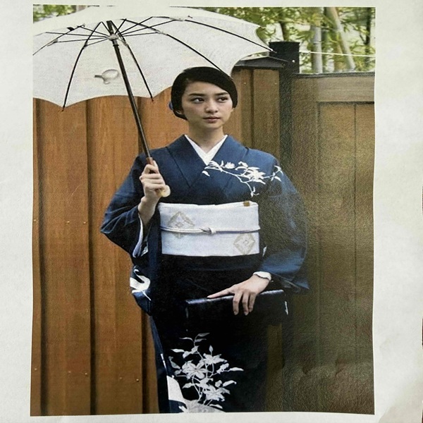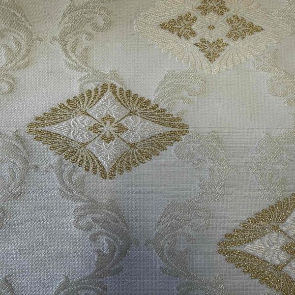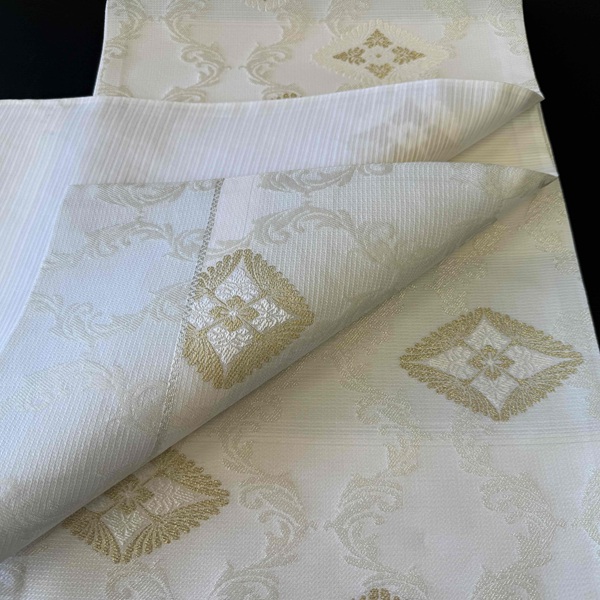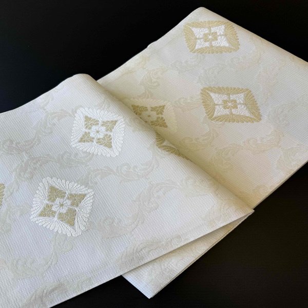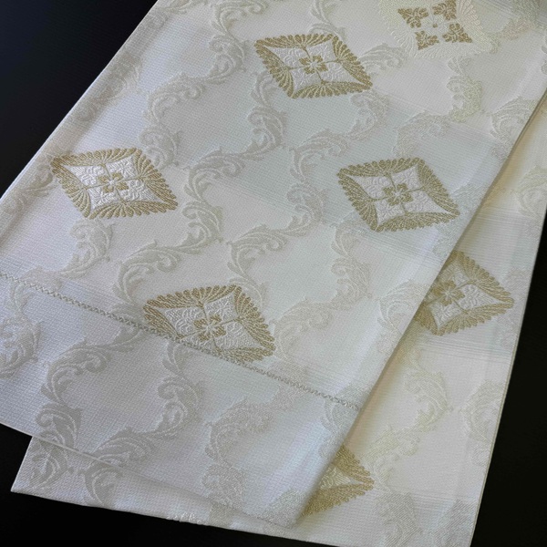 ドラマで女優さんが締めておられた着用柄です。白と薄い青みの鼠色の二段ボカシの地に金糸銀糸で花菱や立湧模様が織られており、