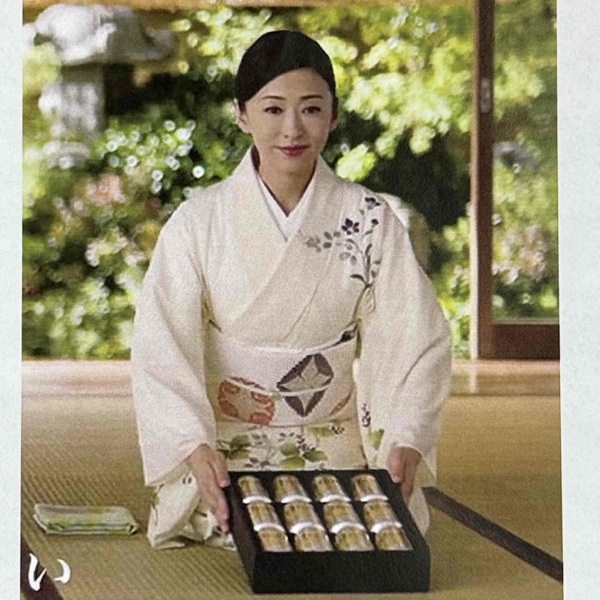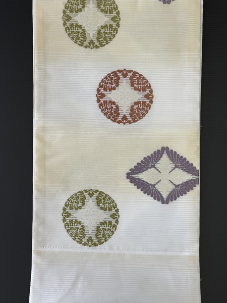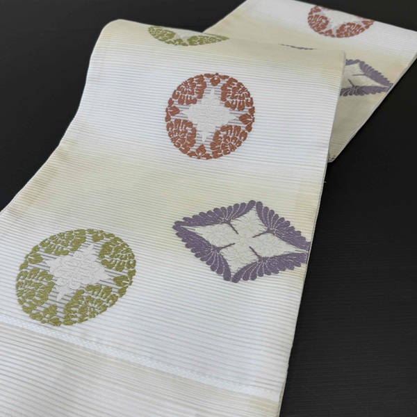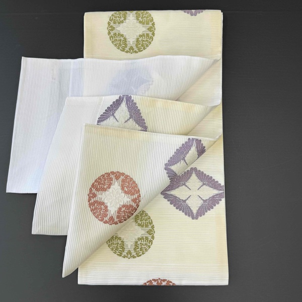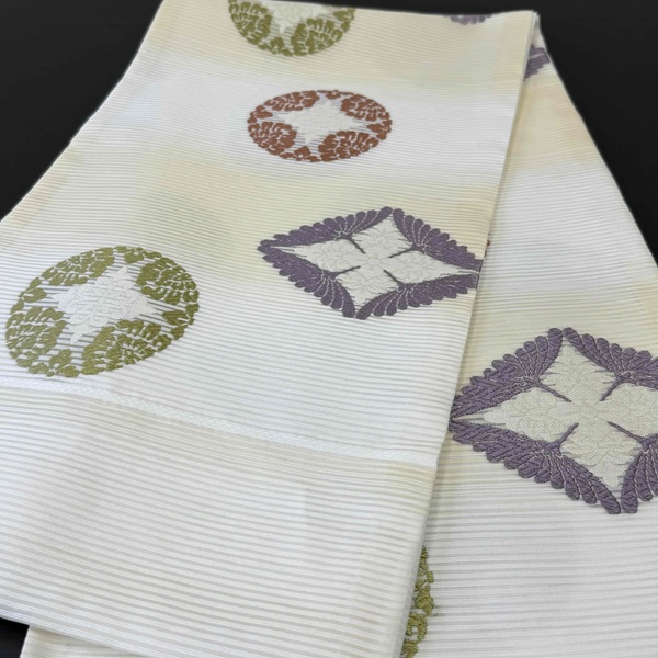 CMで女優さんが締めておられた着用柄です。白とクリーム色の2段ボカシに飛び柄の華紋で、シンプルで合わせやすい帯です。