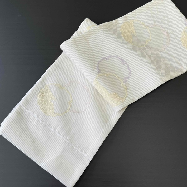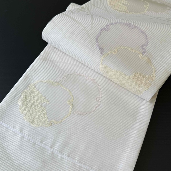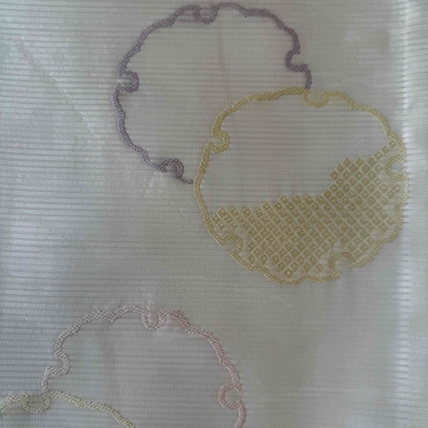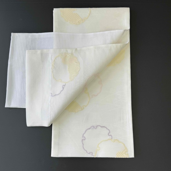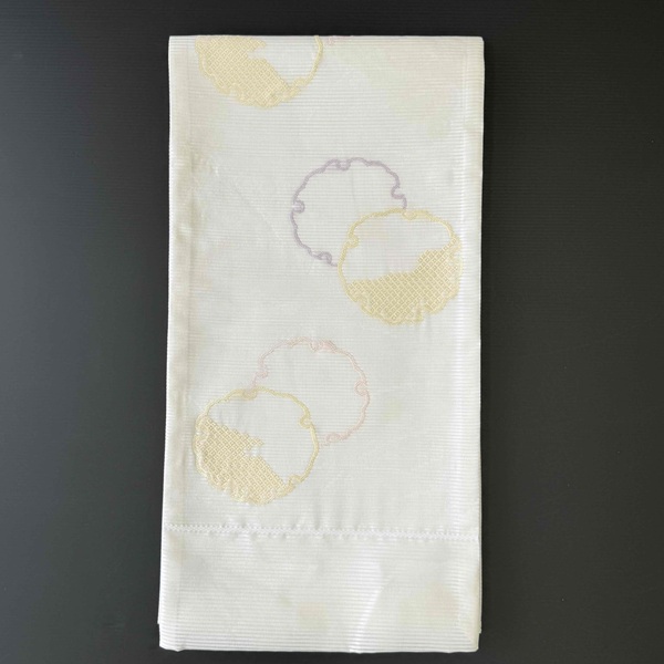 白地にウス黄色、ウス紫色、ウスピンク色の雪輪が施されています。