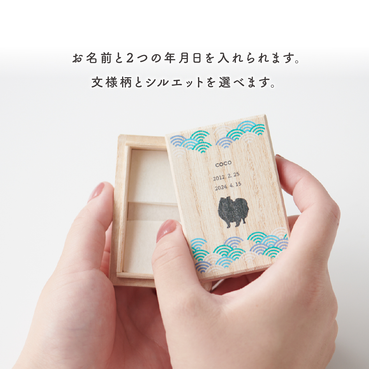 桐箱ケースにはワンちゃんに伝えたい言葉を込めた文様を施しました。
