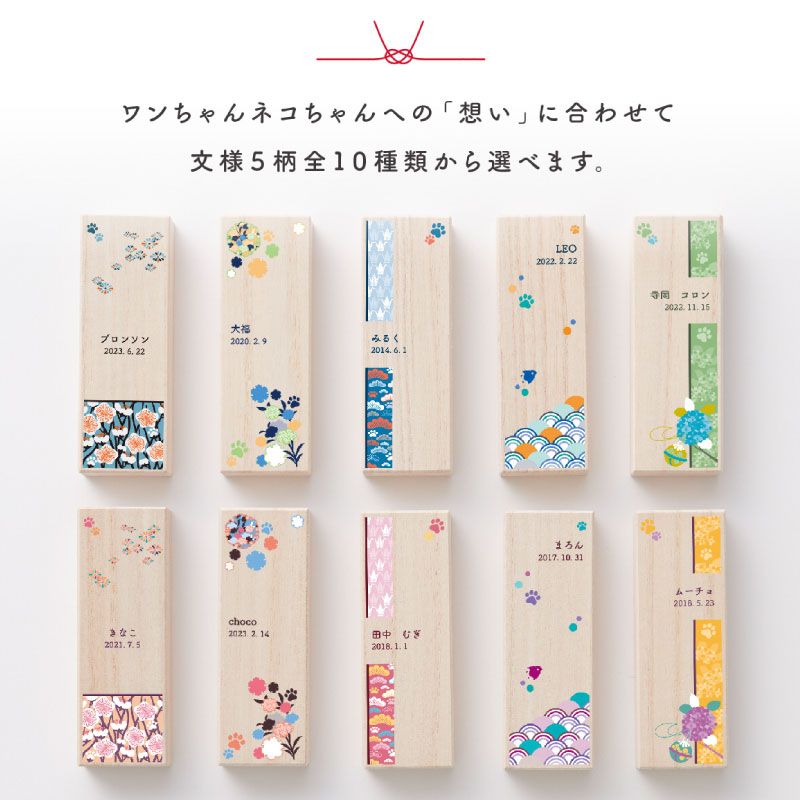また、桐箱ケースにはペットちゃんへの想いを込めた文様を施しました。
