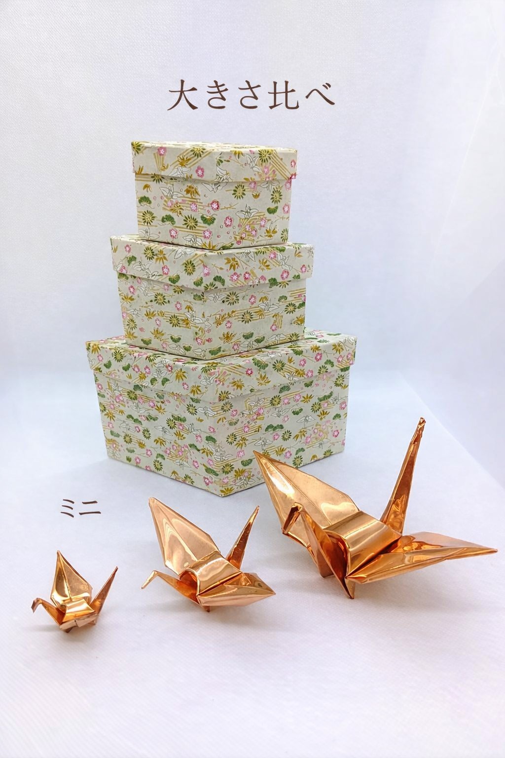 ミニ・小・大、3サイズの折り鶴を並べた比較イメージです。