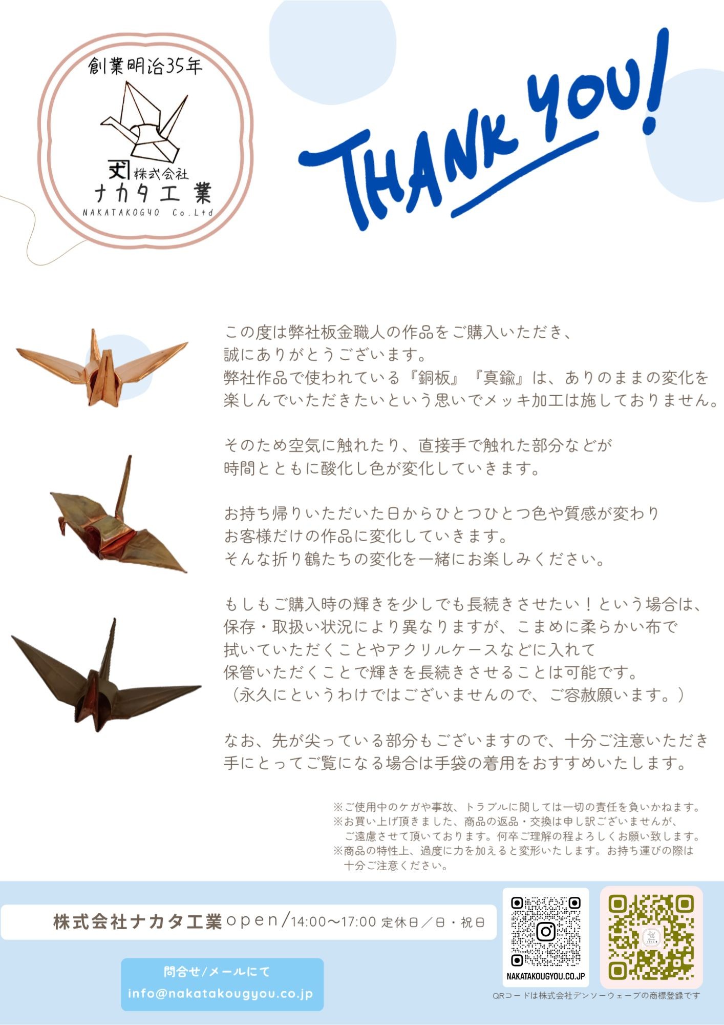 京の銅板折り鶴|サイズ比較(ミニ・小・大)