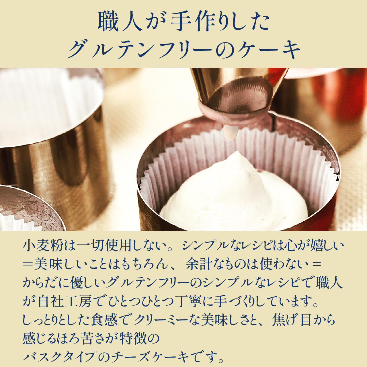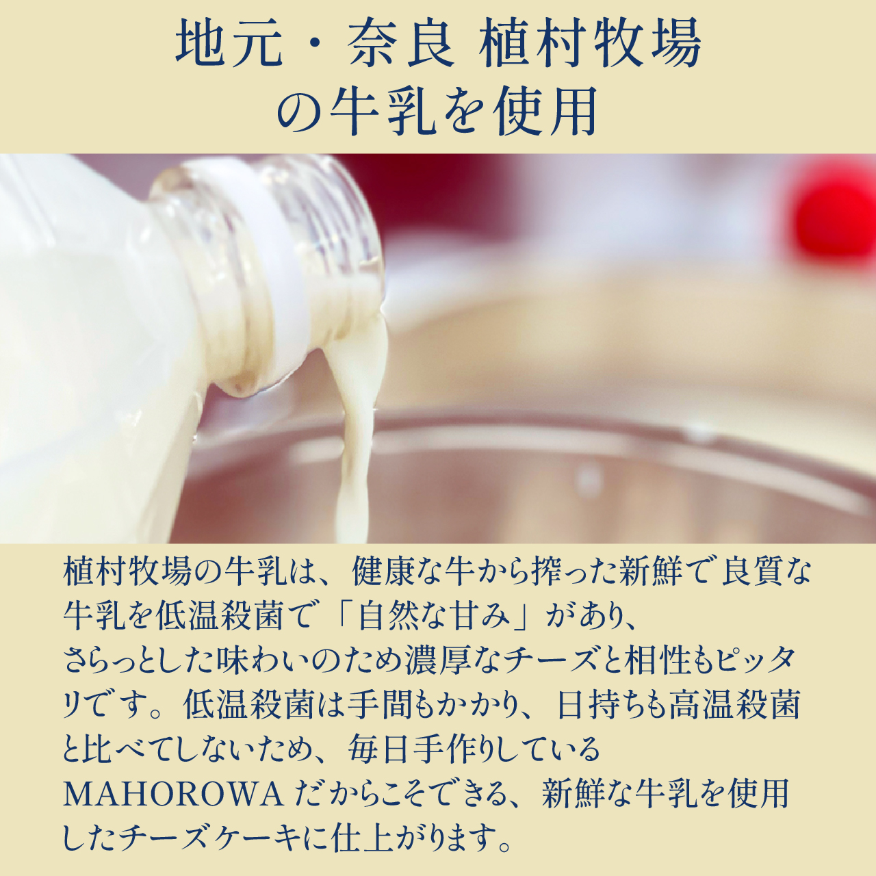 こだわり素材を使用した手作りのミルク風味チーズケーキです。程よい焦げ目がまろやかさを引き立てる、バスクタイプのチーズケーキに仕上げました。小麦粉は使用せずグルテンフリーのシンプルなレシピでお作りします。明治16年創業の奈良・「植村牧場」の低温殺菌牛乳が美味しさの秘訣。牛乳本来の風味を残した、濃厚なミルク感をお楽しみ下さい。