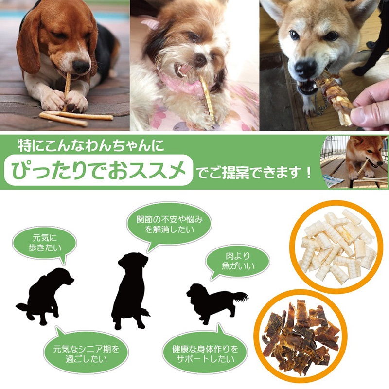 愛犬の骨・関節・歯・皮膚などの健康をしっかりサポート、毎日の食事やおやつにおススメです。
