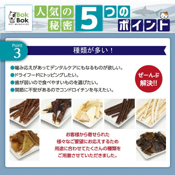 BokBokは幼犬から老犬まで安心して食べられる低カロリー、低脂肪、高タンパクのヘルシーおやつです。