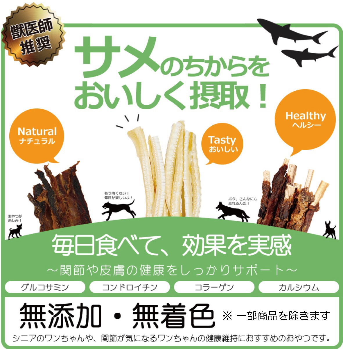 愛犬の骨・関節・歯・皮膚などの健康をしっかりサポート、毎日の食事やおやつにおススメです。