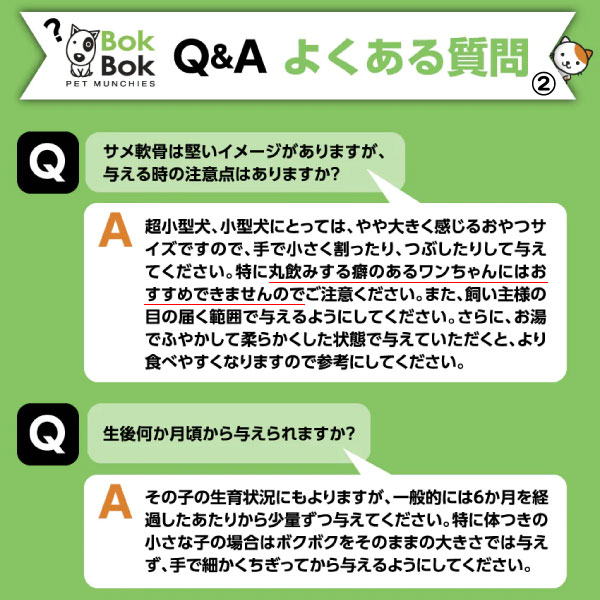 BokBokは幼犬から老犬まで安心して食べられる低カロリー、低脂肪、高タンパクのヘルシーおやつです。